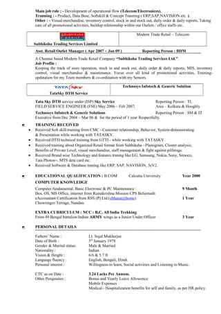 The document provides details of Sanjib Mukherjee's work experience in e-commerce operations and retail management over 11 years, including his current role as E-commerce Operation Manager at Simoco Telecommunications where he is responsible for developing operational workflows and coordinating with online partners like Flipkart, Snapdeal, and Amazon. Prior experience includes management roles at other companies involved in e-commerce operations and retail of electronics, mobile phones, and other products. The document also lists his educational qualifications and skills.