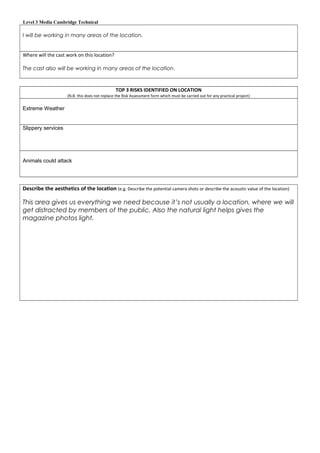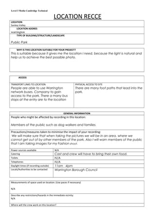 This document provides a location recce for Sankey Valley public park in Warrington for a fashion photo shoot project. It notes that the park is suitable due to natural light and seclusion from the public. Access is available via public transport and footpaths. Precautions will be taken to minimize disruption to park visitors, including warning them and shooting in secluded areas. Potential risks include extreme weather, slippery surfaces, and attacks by animals. The location offers aesthetic value through potential camera shots and natural light free from distractions.