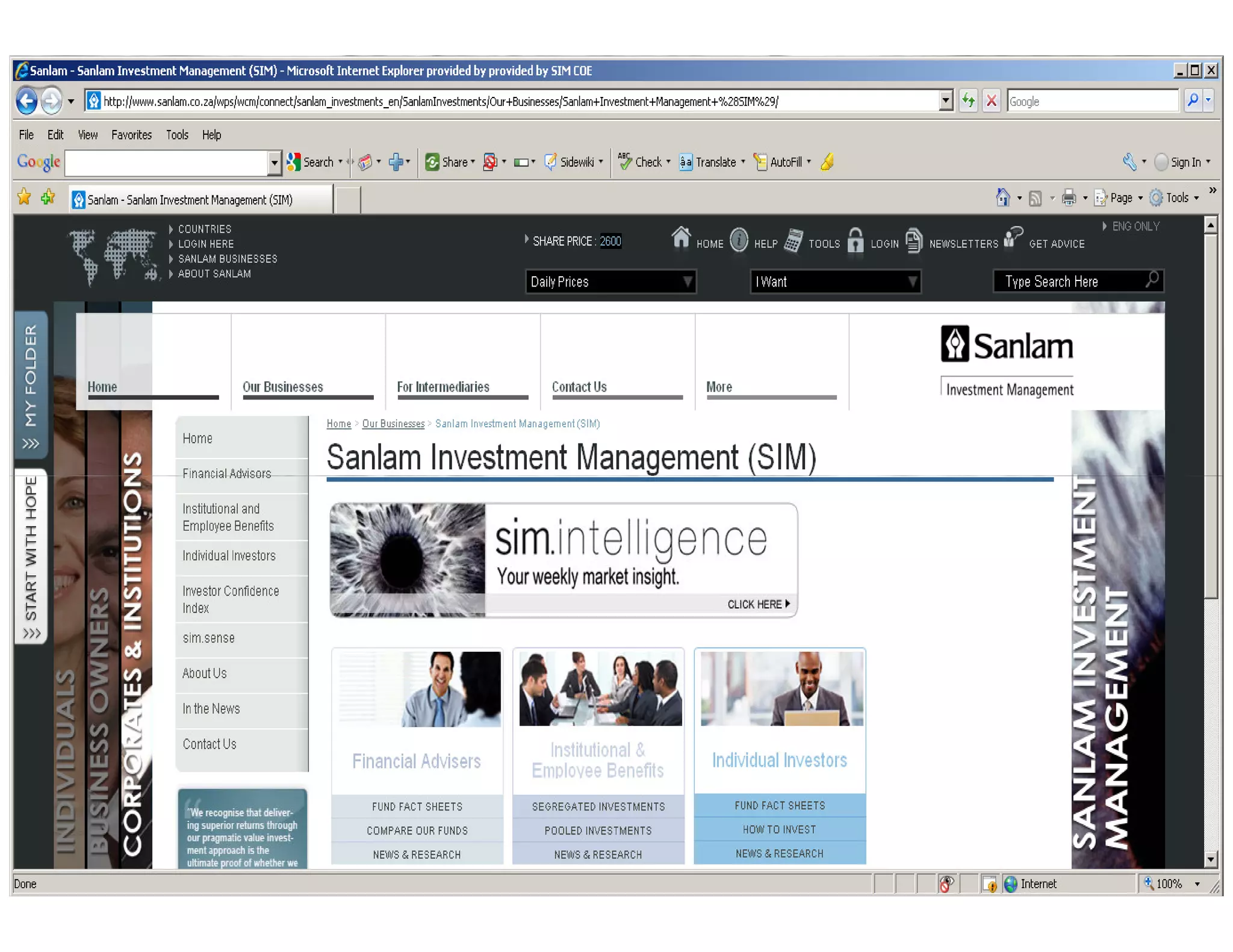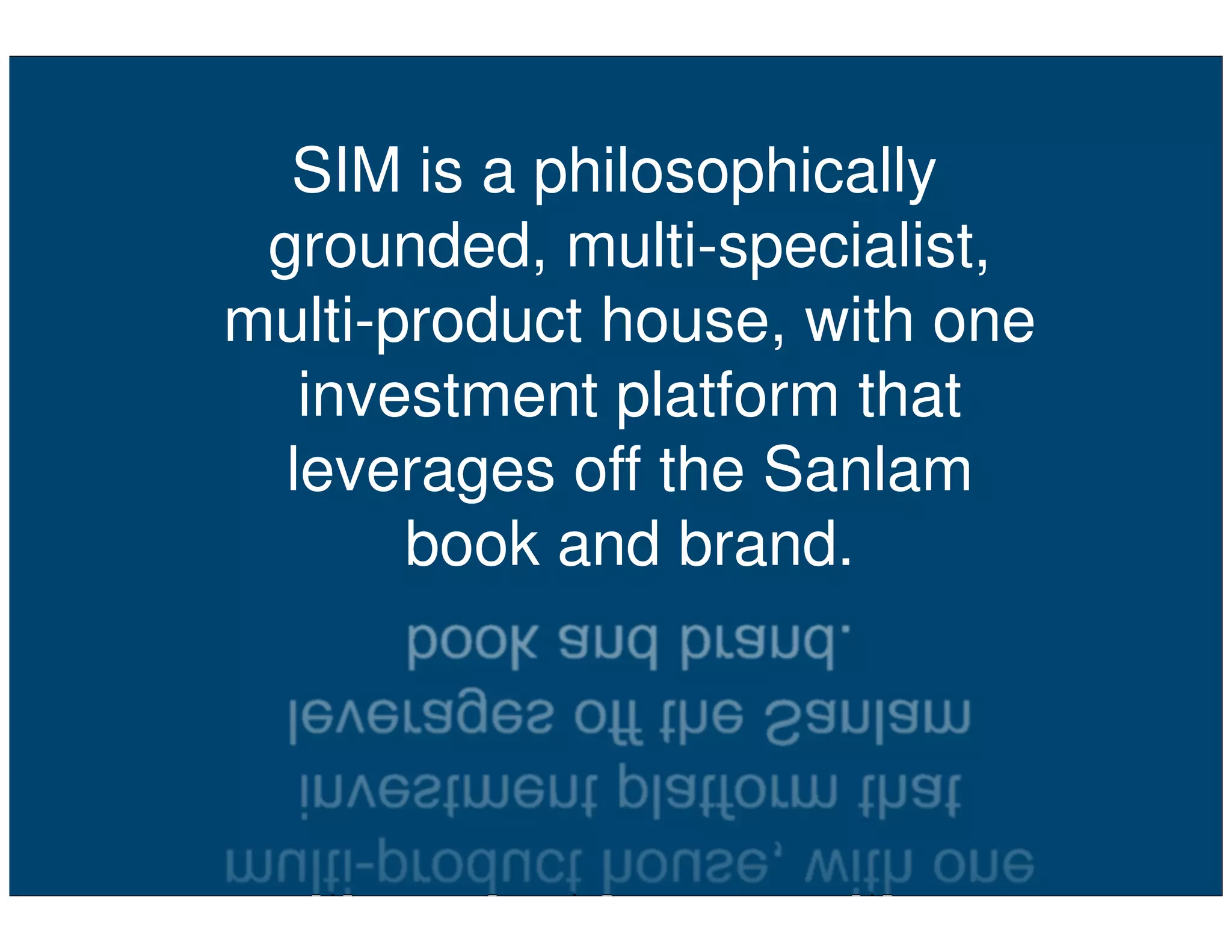 SIM is a philosophically grounded, multi-specialist, multi-product asset manager within the Sanlam group. It has one investment platform that leverages off the Sanlam book and brand. SIM provides asset management services through various specialist teams across multiple asset classes.