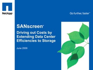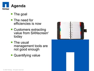 The document discusses driving efficiencies in data center storage through the use of SANscreen software. It notes that typical management tools lack visibility, capacity management, and integration needed to optimize storage. SANscreen provides real-time visibility across multi-vendor environments to help customers extract value through initiatives like capacity management, consolidation, tiering, and cost analysis. Customers report significant cost savings through findings from proof of concept deployments.