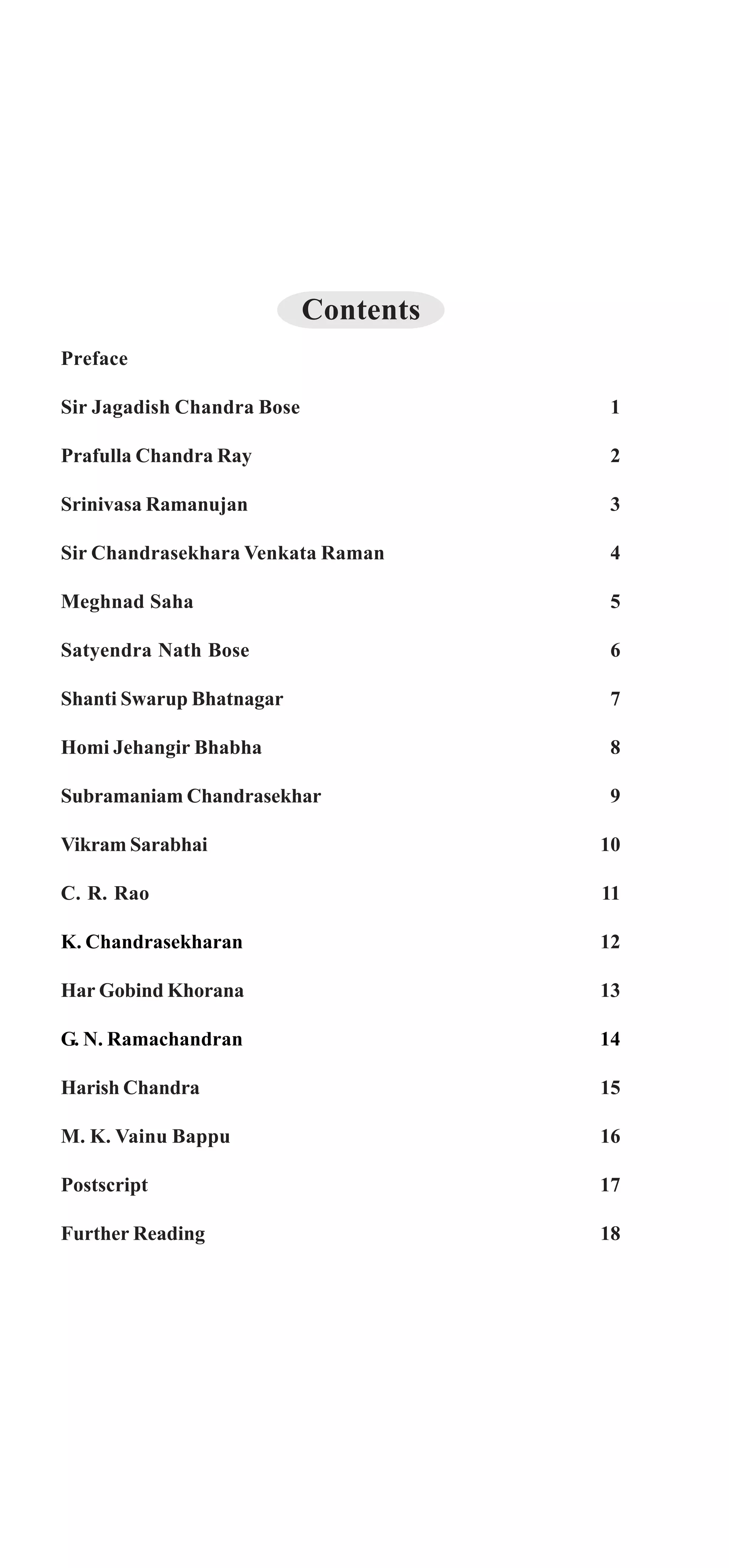 The document provides biographies of 16 famous Indian scientists: Sir Jagadish Chandra Bose, Prafulla Chandra Ray, Srinivasa Ramanujan, Sir Chandrasekhara Venkata Raman, Meghnad Saha, Satyendra Nath Bose, Shanti Swarup Bhatnagar, Homi Jehangir Bhabha, Subramaniam Chandrasekhar, Vikram Sarabhai, C. R. Rao, K. Chandrasekharan, Har Gobind Khorana, G. N. Ramachandran, Harish Chandra, and M. K. Vainu Bappu. It discusses their early lives