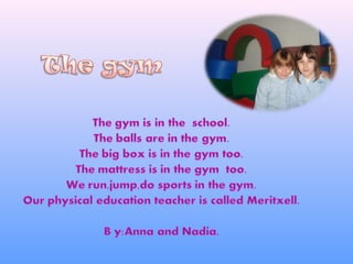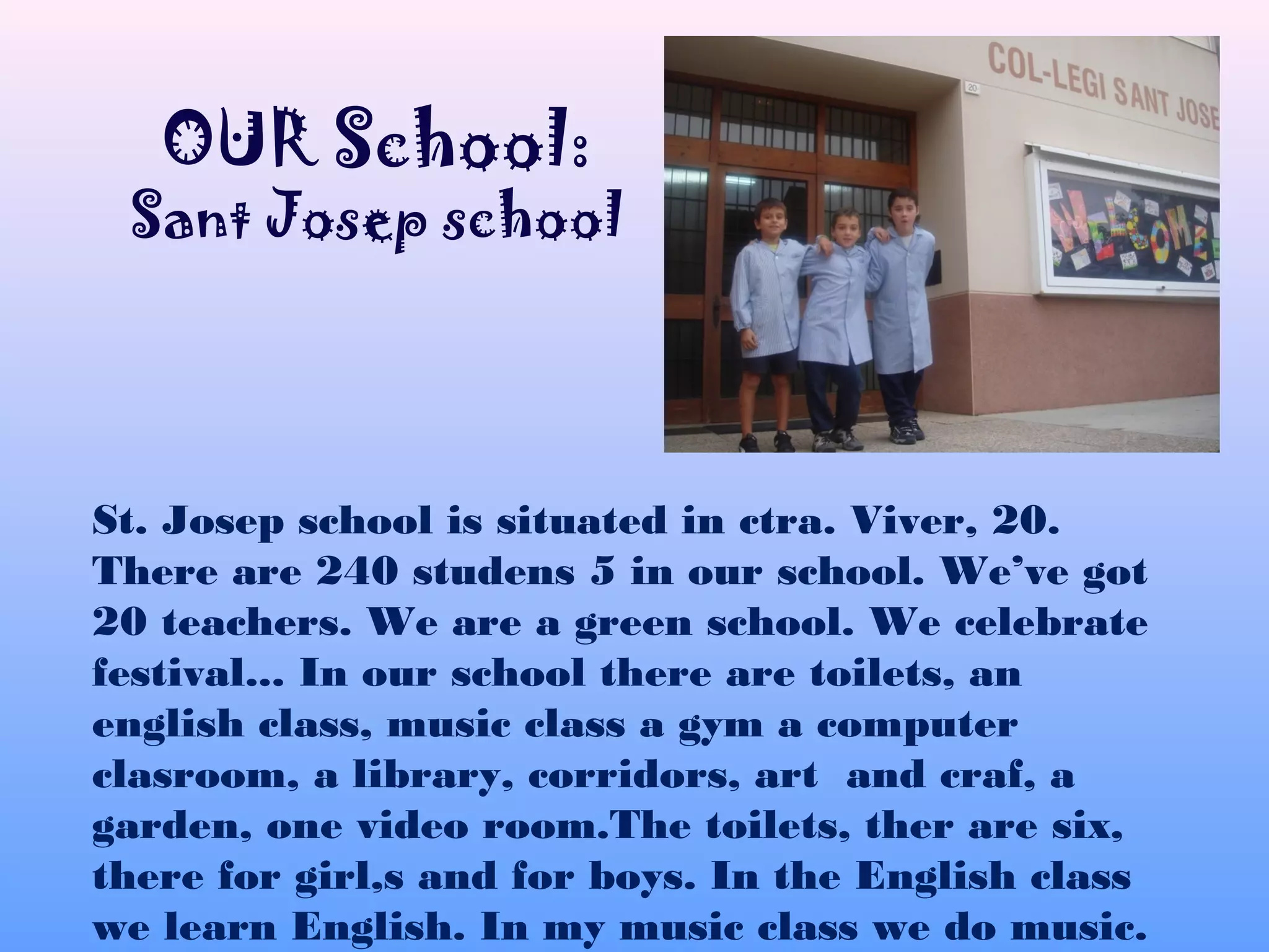 St. Josep school has 240 students and 20 teachers. It has many facilities including classrooms for various subjects like English, music, computer, and more. There is also a library, gym, playgrounds, and kindergarten. The document provides descriptions of each area from the perspectives of different students, detailing what activities are done and what equipment is available in each room.