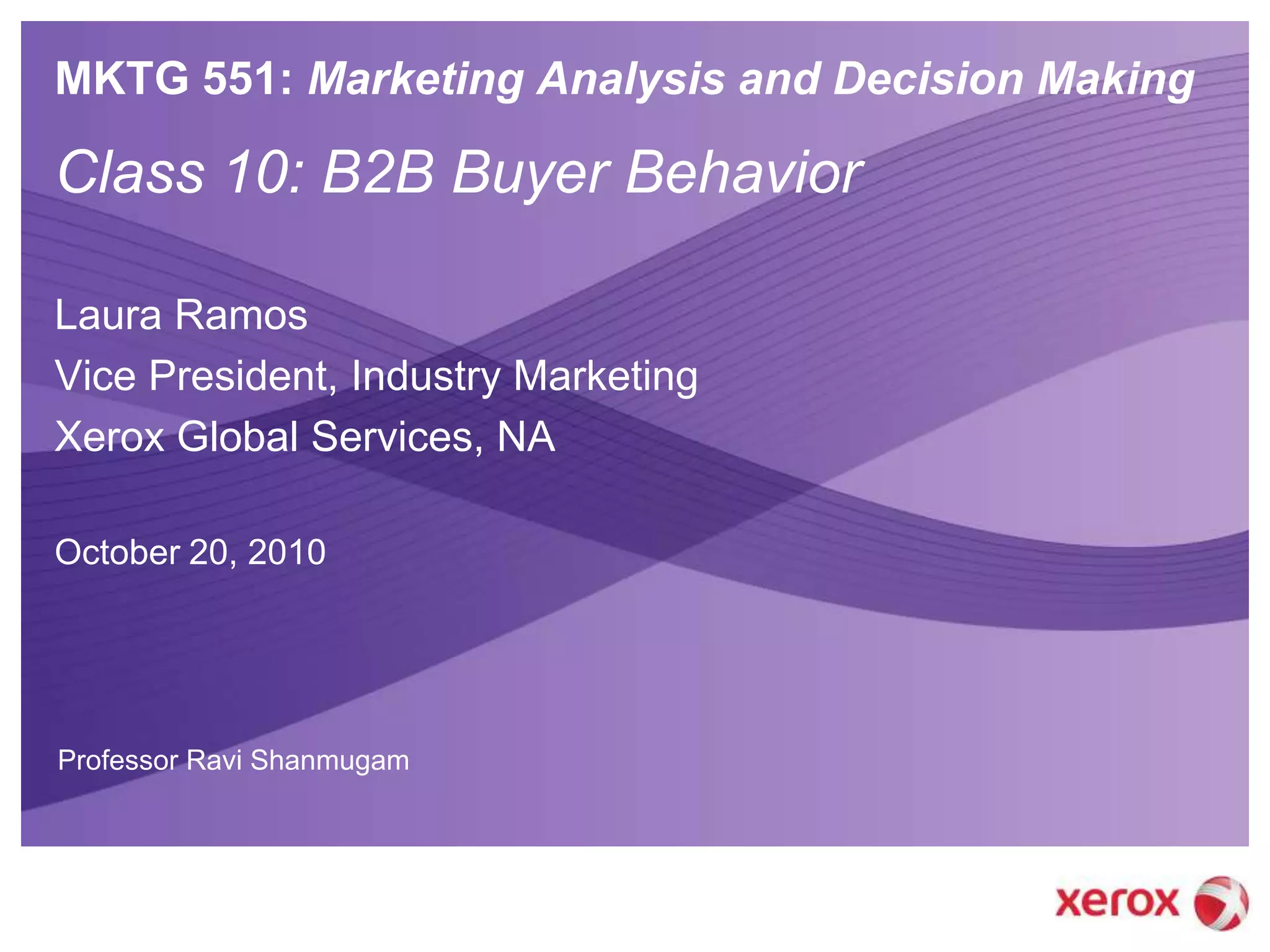 The document outlines key concepts in B2B marketing, emphasizing the importance of understanding buyer behavior and market segmentation. It highlights the challenges faced by B2B marketers and provides insights into effective marketing strategies, including the use of personas. The need for analytics-driven insights and a focus on the buyer's journey is underscored to enhance marketing effectiveness and align with business objectives.