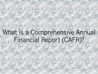 The document discusses the concept of a public bank for Santa Fe, New Mexico, contrasting it with traditional financial practices and emphasizing the potential benefits such as local job creation and consistent returns. It explains the nature of Comprehensive Annual Financial Reports (CAFRs) and highlights Santa Fe's current debt and investment strategies, arguing that investments in a public bank could be more prudent. The document advocates for reallocating some CAFR funds into a public banking system to improve fiscal stability and community support.