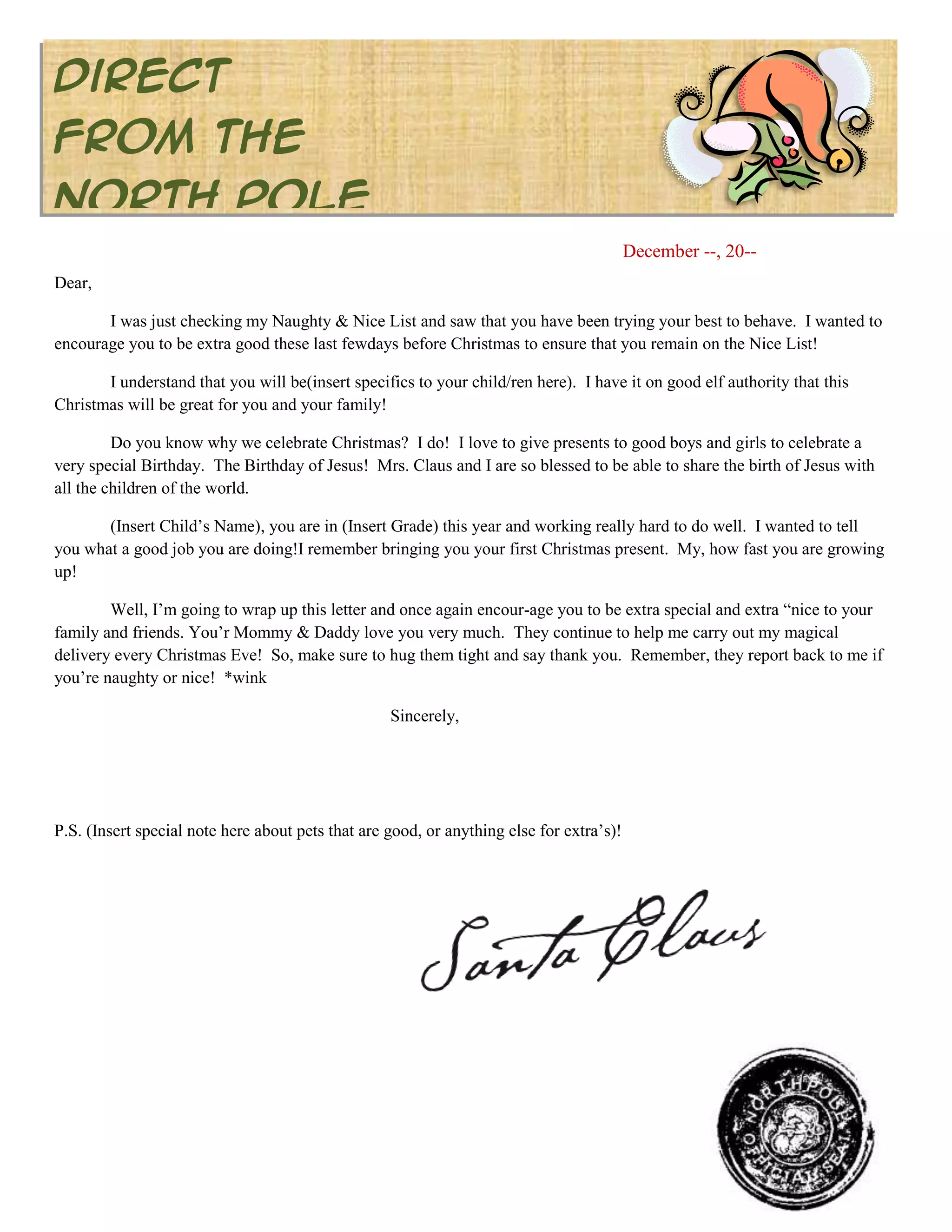 Santa encourages the child to continue being good in the last few days before Christmas to stay on the Nice List. He reminds the child that Christmas is about celebrating Jesus's birthday. Santa praises the child for working hard in their grade and growing up fast. He encourages the child to be extra nice to their family and friends before Christmas Eve arrives.
