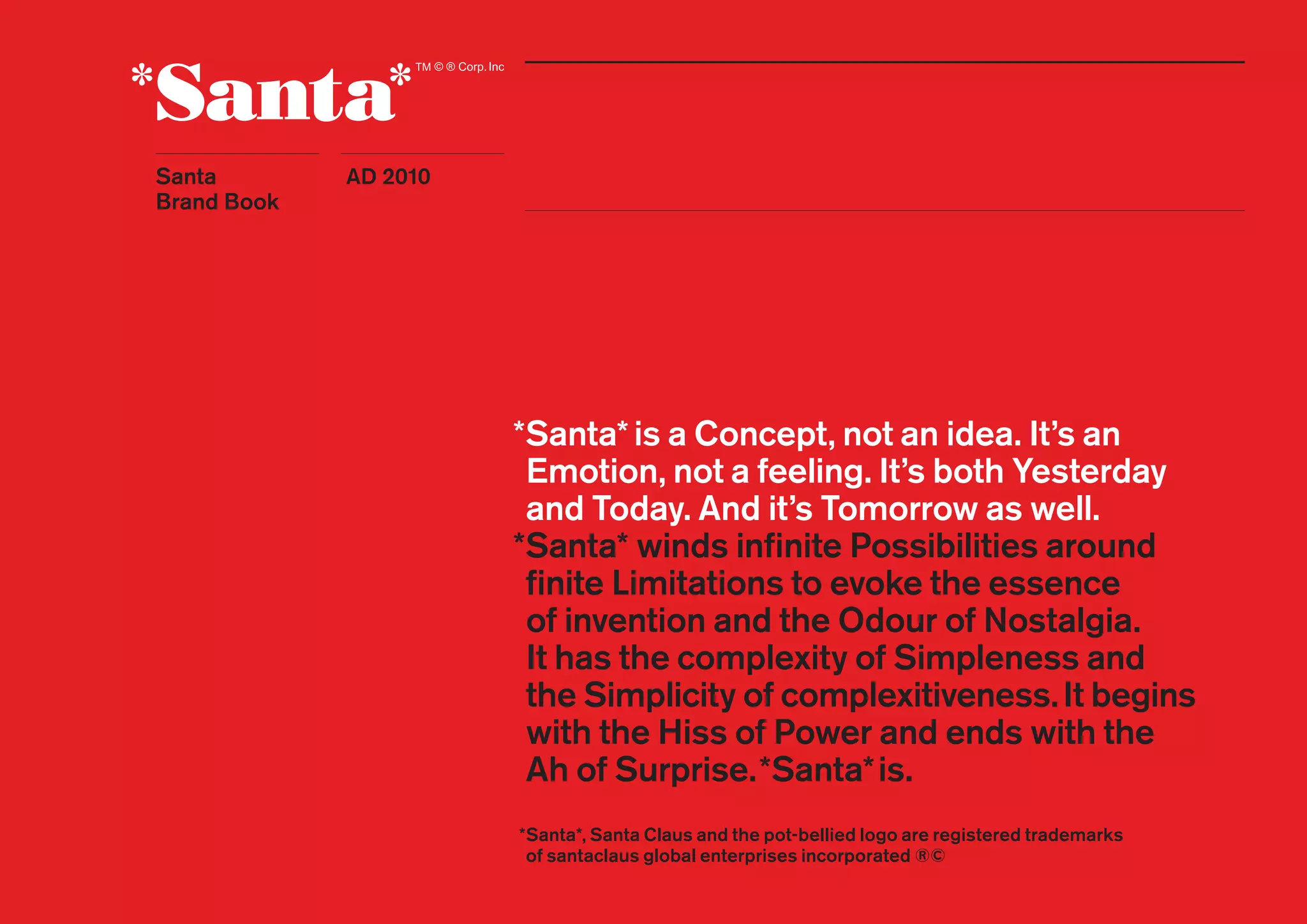 This document provides branding guidelines for the Santa brand. It establishes that Santa is a concept representing emotion, past, present and future. The branding emphasizes simplicity, nostalgia, and imagination. It outlines Santa's brand promise of excellence, measurability, accountability and snow. Graphics and language guidelines establish proper usage of Santa's color (red), font, imagery, and terminology to communicate the brand. Charts depict how belief in Santa declines with age and how the brand compares to competitors. Decision trees advise when and how to leverage the Santa brand across touchpoints.