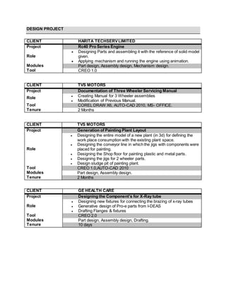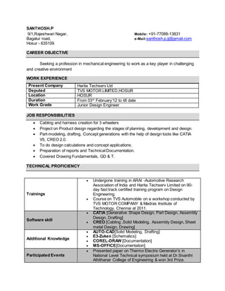 This document contains the resume of Santhosh Parthasarathy. It summarizes his educational qualifications, work experience, technical skills and design projects. He has a B.E in Mechanical Engineering from JJCE and over 5 years of work experience as a Junior Design Engineer. His responsibilities have included cabling, harness creation, product design, modeling and technical documentation using software like CATIA, Creo and AutoCAD. He has worked on projects for companies like Harita Techserv, TVS Motors and GE Healthcare.