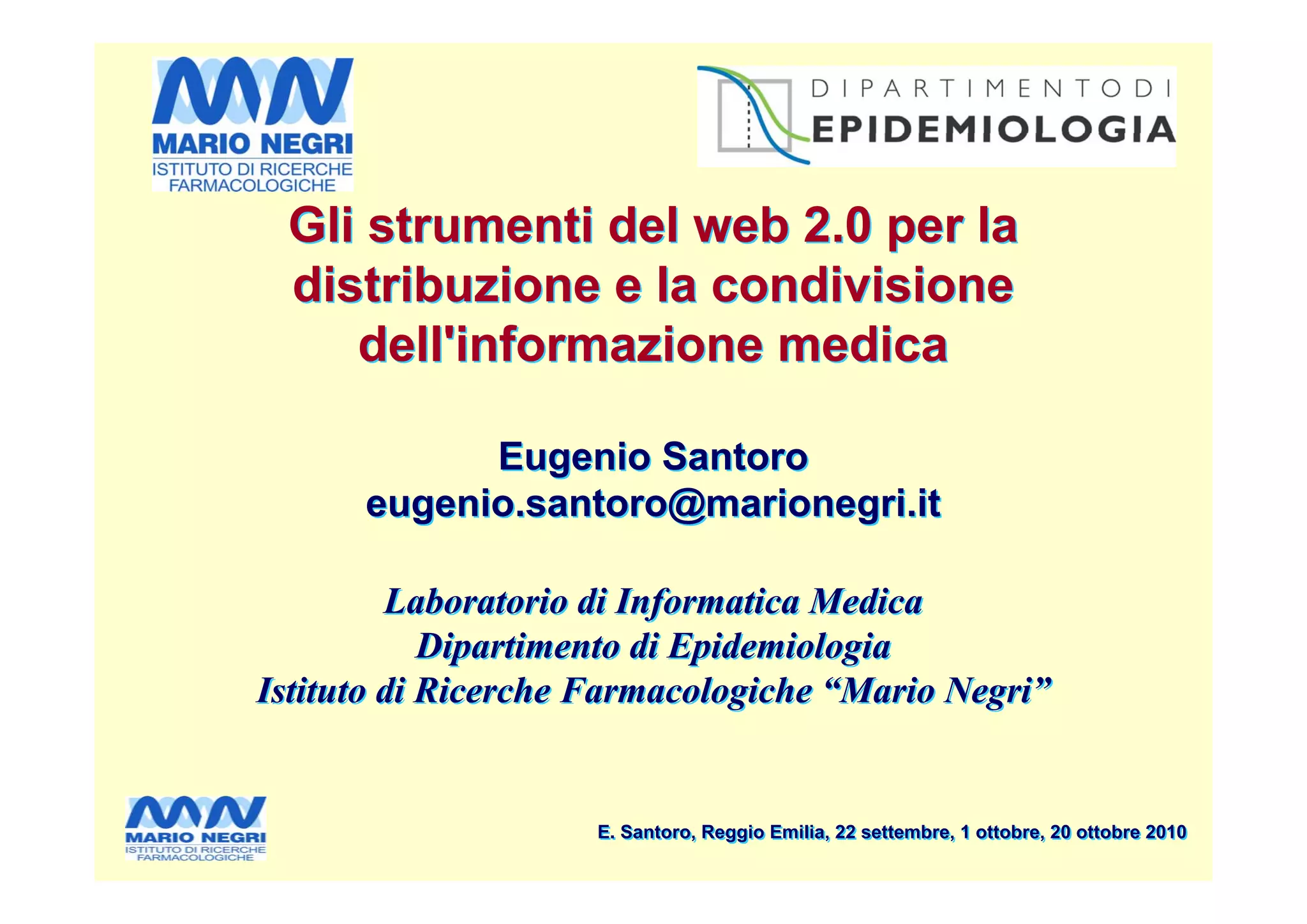Il documento discute l'importanza del web 2.0 nella distribuzione e condivisione di informazioni mediche, evidenziando la partecipazione dei medici nell'utilizzare e contribuire a contenuti online. Vengono presentati vari strumenti del web 2.0, come RSS, podcast, social bookmarking e blog, utilizzati per facilitare l'accesso e la diffusione della conoscenza medica. Inoltre, il documento sottolinea il ruolo dell'intelligenza collettiva e la crescente interazione tra professionisti della salute attraverso queste piattaforme.