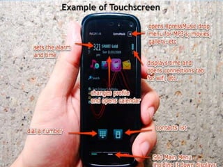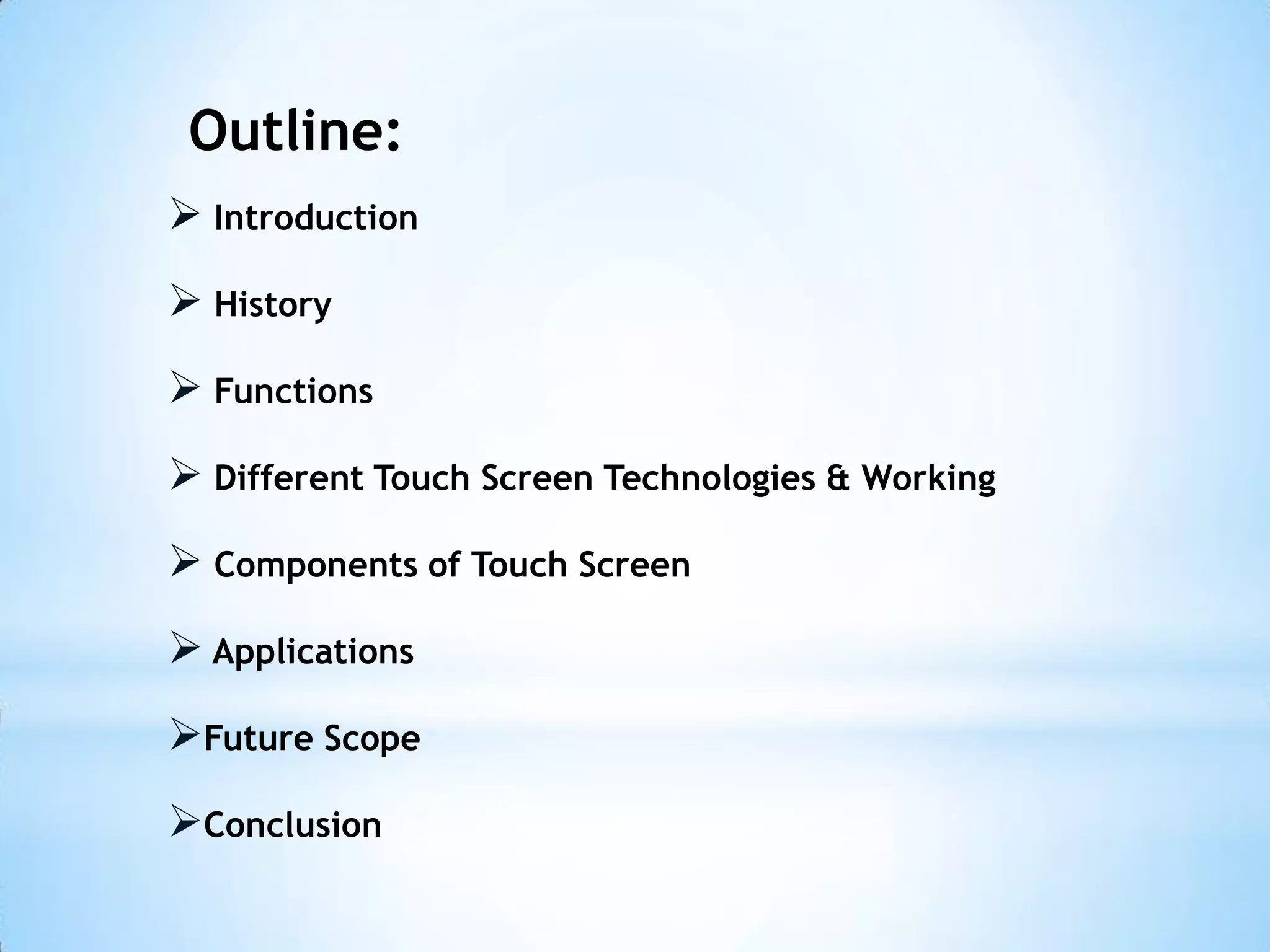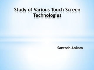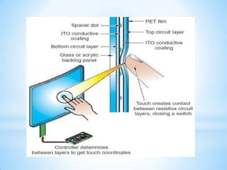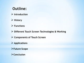 The document provides an overview of touch screen technologies, including their history, functions, various types, advantages and disadvantages, and applications. It details the evolution from the first touch sensor developed in 1971 to modern technologies like capacitive and surface acoustic wave touch screens, highlighting how they work and their components. Additionally, it discusses future developments and the potential for replacing traditional input methods like keyboards and mice.