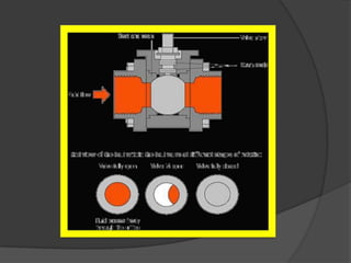 Control valves are used to control conditions like flow, pressure, and temperature by opening or closing in response to signals from controllers comparing a setpoint to a process variable measured by sensors. Control valves are usually operated automatically by electric, hydraulic or pneumatic actuators positioned based on control signals. Common types of control valves include ball valves, butterfly valves, gate valves, and globe valves.