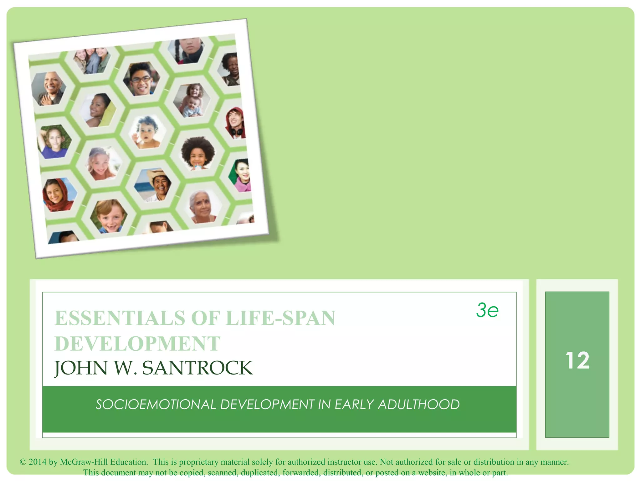 This chapter discusses socioemotional development in early adulthood. It covers how experiences during this period influence personality later in life. Attachment styles formed in childhood impact relationships. The chapter also examines love, relationships, and different lifestyles like single, married, divorced adults. Challenges like making marriages work and parenting are addressed.