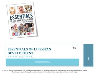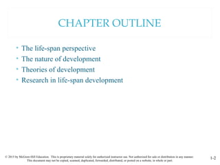 This document outlines chapters from a textbook on life-span development. It covers key topics like the life-span perspective, theories of development, and research methods. The life-span perspective views development as a lifelong process shaped by biological, cognitive and social factors. Major theories discussed include psychoanalytic, cognitive, behavioral, and ecological approaches. Research methods outlined are observation, surveys, tests, case studies and physiological measures.