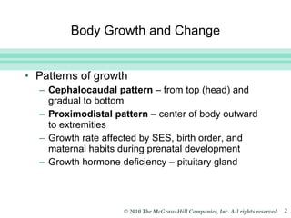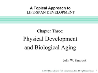 This document summarizes physical development and aging across the human lifespan. It discusses patterns of growth from infancy to puberty and changes that occur in early, middle, and late adulthood. Key topics covered include changes in height, weight, body proportions, hormones, sexuality, brain development, sleep patterns and longevity.