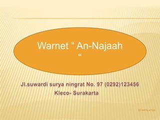 Dokumen ini menjelaskan tentang warnet 'An-Najaah' yang dikelola oleh Slamet Raharjo dengan berbagai fasilitas seperti parkir gratis, koneksi internet cepat, dan peralatan untuk browsing serta pelatihan internet. Dalam laporan pengunjung terdapat data yang menunjukkan peningkatan jumlah pengunjung dari tahun 2007 hingga 2009. Struktur organisasi warung internet ini juga mencakup posisi-posisi seperti manager dan teknisi.
