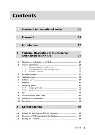 This document provides an overview of the technical realization of the client/server architecture in SAP R/3 and describes how to perform basic system administration tasks. It covers topics such as starting and stopping the database and SAP instances, monitoring system status, managing background jobs, configuring the update system, and setting up output management. The document also discusses user administration, authorizations, and transport management.