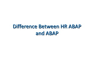 HR ABAP uses logical databases, infotypes, and macros to store and retrieve time-dependent employee data. Logical databases provide standardized selection screens and automatic authorization checks when accessing infotype records. Compared to general ABAP, HR ABAP makes greater use of logical databases, covers additional HR concepts like infotypes and time-dependent data, and uses macros and functions modules specific to HR processes. Key differences include the storage of employee data in infotypes, retrieval of records using logical databases and macros, and authorization checks for valid employee and infotype access.