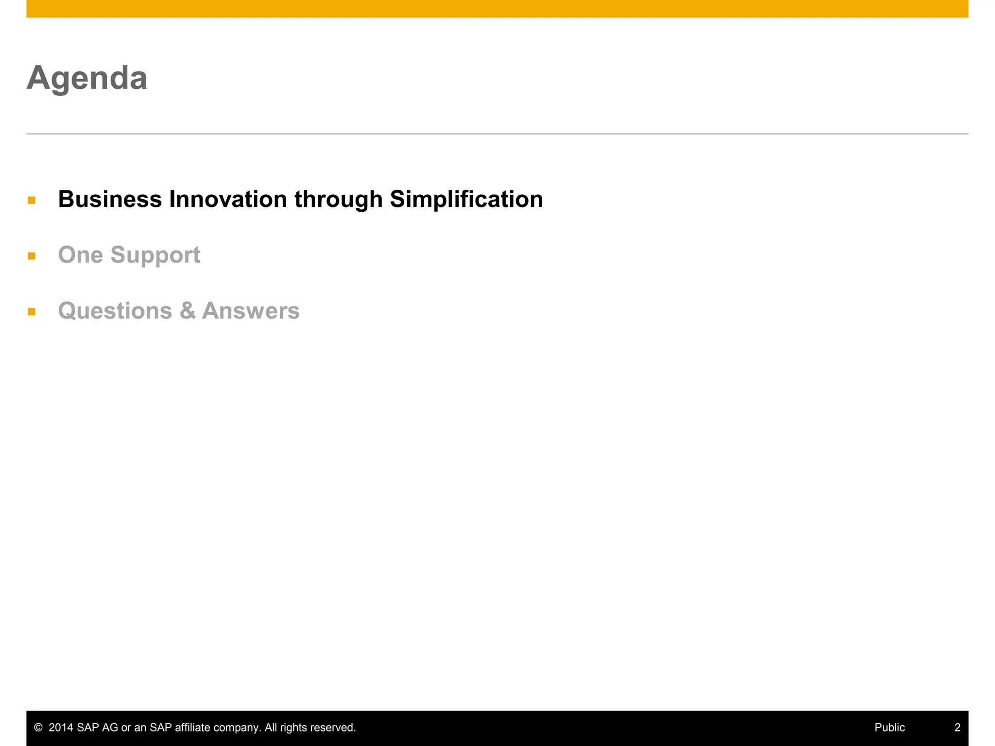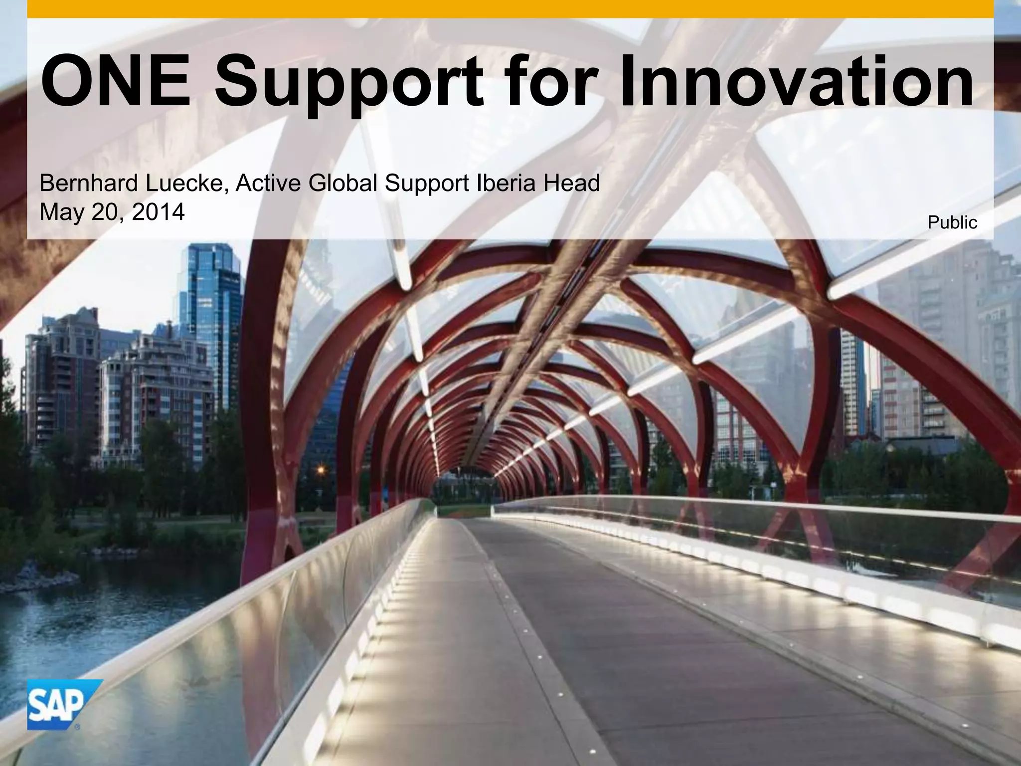 The document outlines SAP's approach to business innovation through simplification and support services, emphasizing the need for companies to adapt to technological changes and leverage big data to enhance customer experiences. It introduces the 'One Support' program, which integrates cloud and on-premise solutions to streamline support and create a unified customer experience across various lifecycle phases. Additionally, the document highlights the importance of transforming business processes to remain competitive in the evolving market landscape driven by a millennial workforce and emerging technologies.
