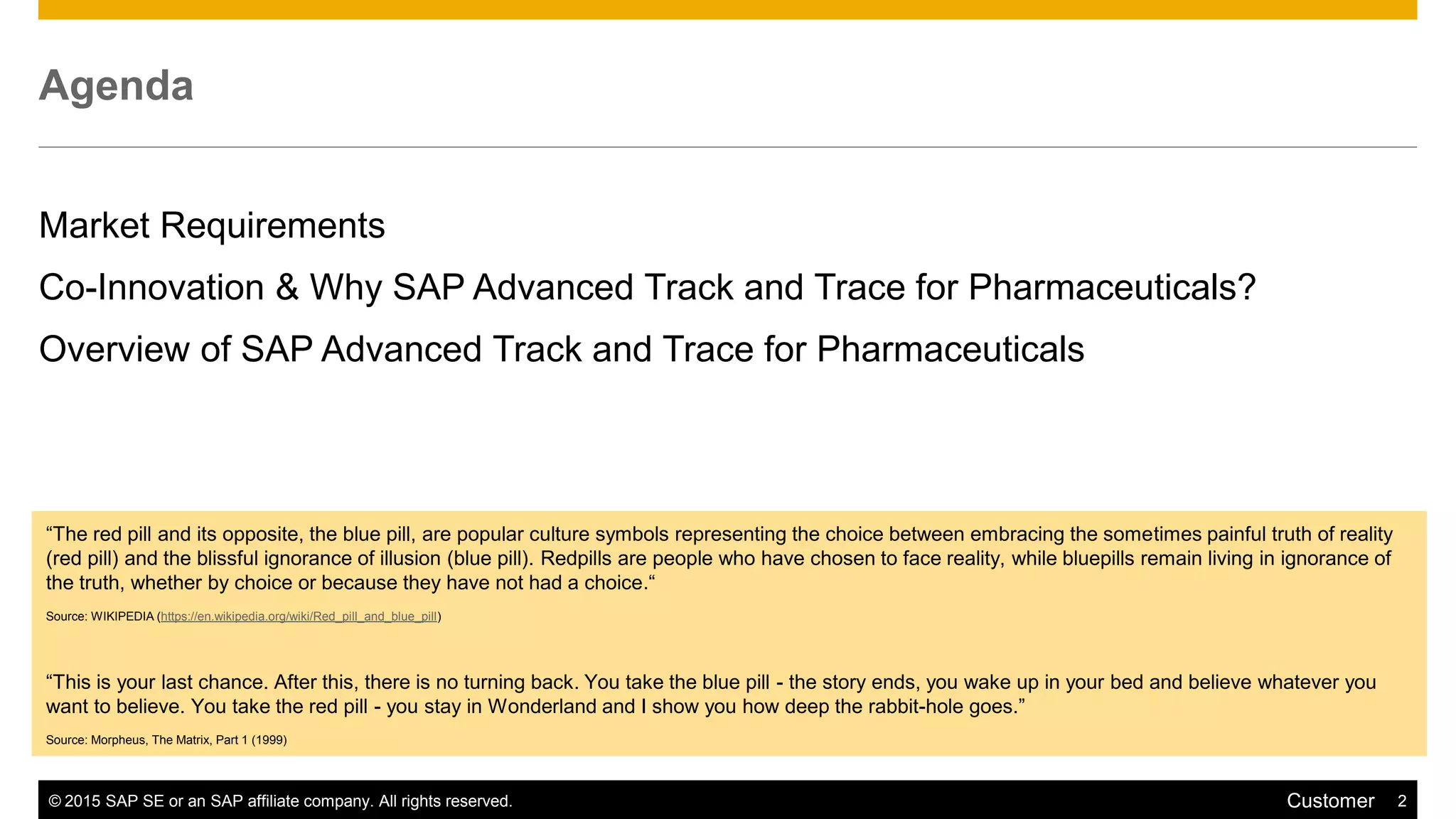 SAP Advanced Track and Trace for Pharmaceuticals is a solution that addresses global serialization requirements due to increasing legislation aimed at combating counterfeit drugs, requiring drug manufacturers to implement serialization, reporting, and compliance measures. The solution involves a comprehensive corporate serialization repository that integrates with existing ERP and supply chain systems, allowing efficient management of serialized items and compliance with international regulations. Developed through co-innovation with leading pharmaceutical companies, it aims to facilitate large-scale data handling and regulatory reporting for the pharmaceutical industry.