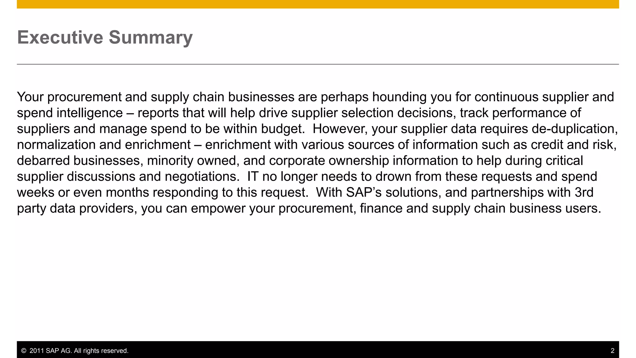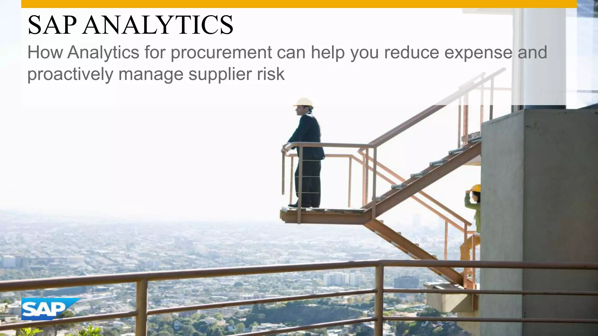 The document discusses SAP Analytics for procurement. It describes how procurement and supply chain organizations are under pressure to reduce expenses and proactively manage supplier risk through continuous supplier and spend intelligence reporting. However, supplier data often requires de-duplication, normalization and enrichment before it can provide useful insights. SAP solutions partner with third-party data providers to empower procurement, finance and supply chain users with supplier and spend analytics capabilities. The document then outlines key components of SAP's offering including data enrichment and classification, spend performance management, and best practices.