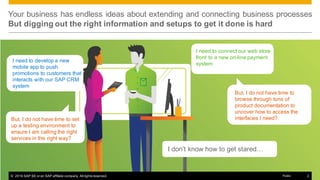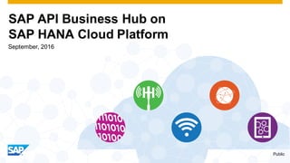 The SAP API Business Hub provides a central catalog for developers to search, discover, test, and consume APIs from SAP and its partners. It simplifies learning through documentation and sandbox API testing, and accelerates innovation by consolidating APIs in one place. Developers can access the API catalog, documentation, and sandbox testing environment through the SAP API Business Hub service on SAP HANA Cloud Platform.