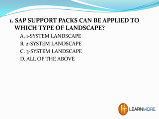 The document contains multiple-choice questions and answers related to SAP Basis concepts, including support packs, client defaults, transport management, and system architecture. Each question is presented with four options, and the correct answer is provided for each inquiry. The document is designed as a learning resource for those studying SAP Basis and related IT courses.