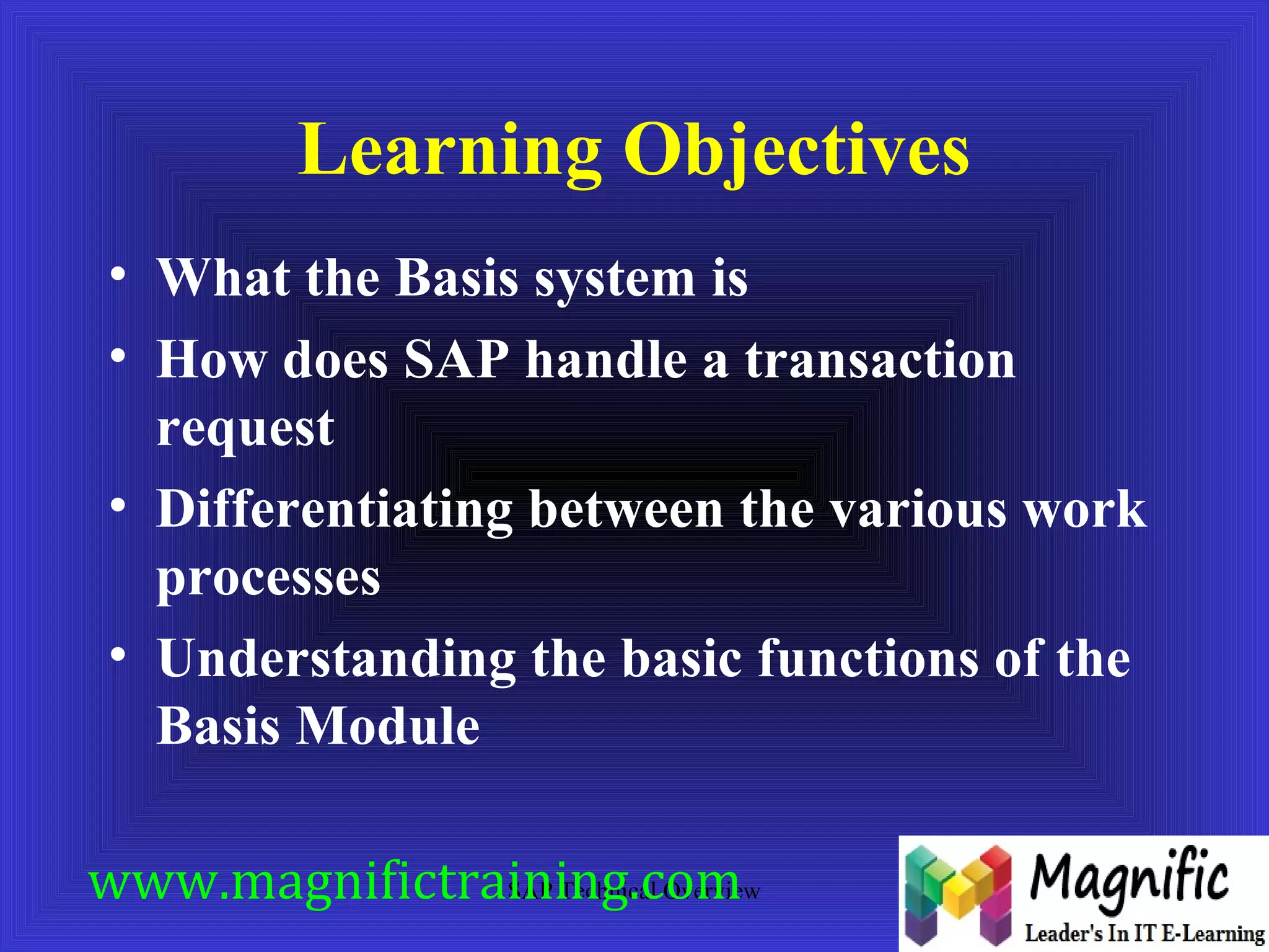 The document provides an overview of an SAP Basis online training session, covering learning objectives such as user administration, transaction processing, and SAP system architecture. It details the various work processes within the SAP R/3 system including dialog, background, and update processes, as well as essential functions such as user management, client maintenance, and performance tuning. Additionally, it mentions the support and resources available post-training, alongside contact information for further inquiries.
