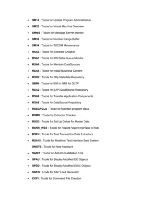 This document lists transaction codes for various SAP BASIS administration tasks. It includes transactions for ABAP development, user administration, transports, integration, mobile, and more. The transactions cover areas like customizing, monitoring, maintenance, and administration for key SAP modules and technologies.