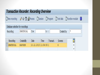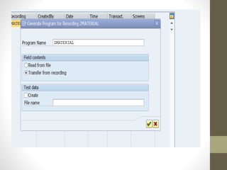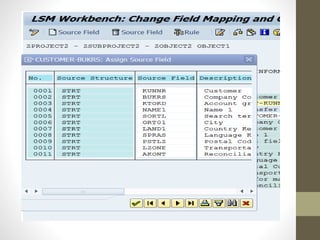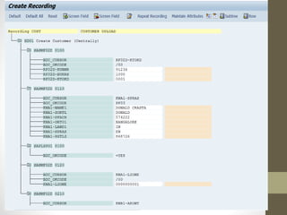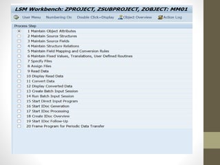 This document describes two methods for uploading batch data from a legacy system to SAP: the call transaction method and session method. It provides steps for both methods, which include getting a flat file, creating a program recording, defining a data structure, uploading the data, and executing transactions via BDC calls or a session. The document also describes using LSMW for legacy system migration, with steps like creating a project, recording transactions, defining source structures and fields, and relating structures.