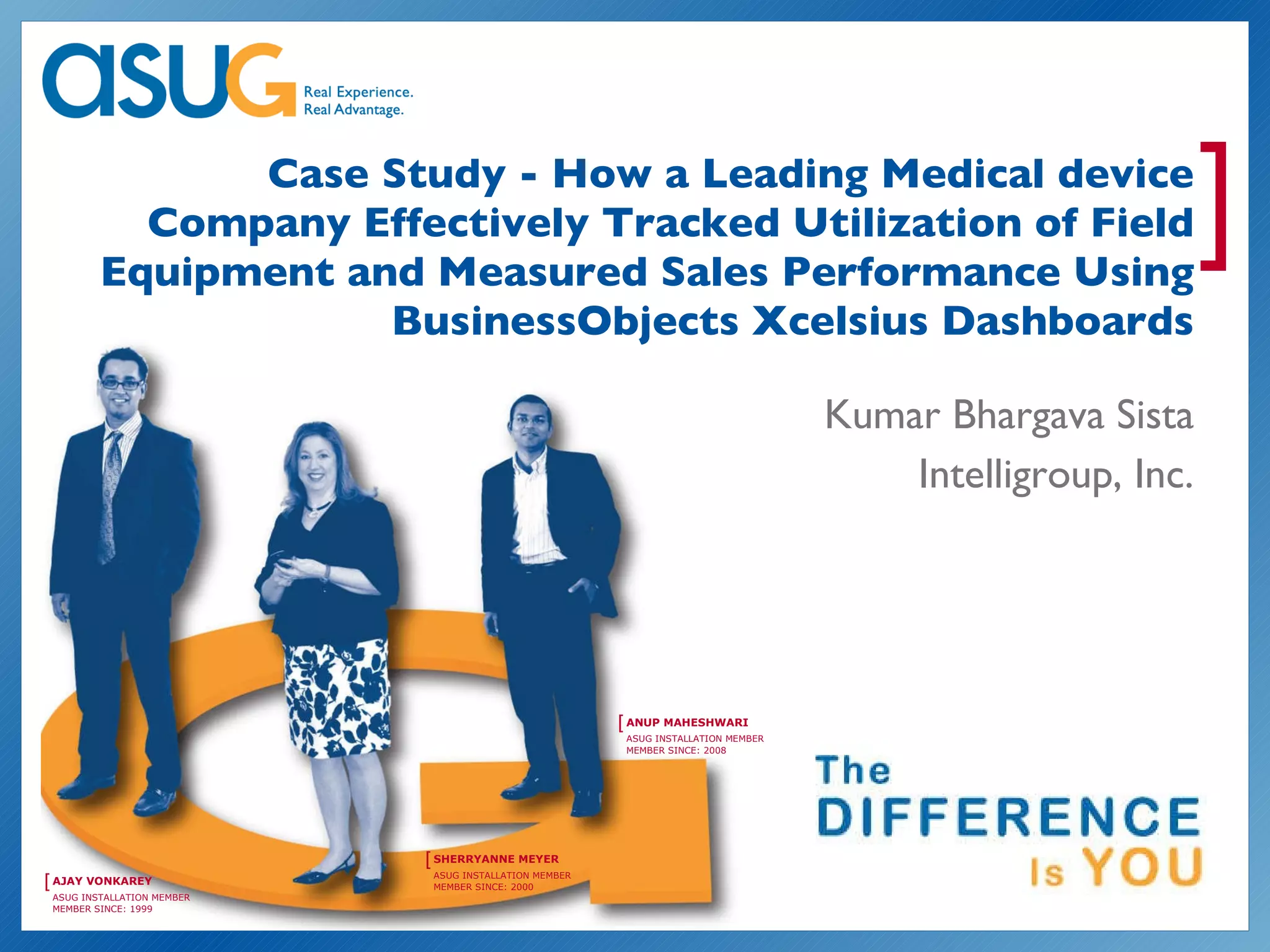 The case study discusses how a leading medical device company implemented BusinessObjects Xcelsius dashboards to enhance visibility into the utilization of field equipment and track sales performance. By developing an interactive dashboard, the company aimed to optimize asset deployment, improve sales efficiency, and save millions by reducing unnecessary inventory while maintaining sales effectiveness. Key benefits included increased accountability among the sales force, streamlined operations, and enhanced decision-making capabilities based on real-time data analysis.