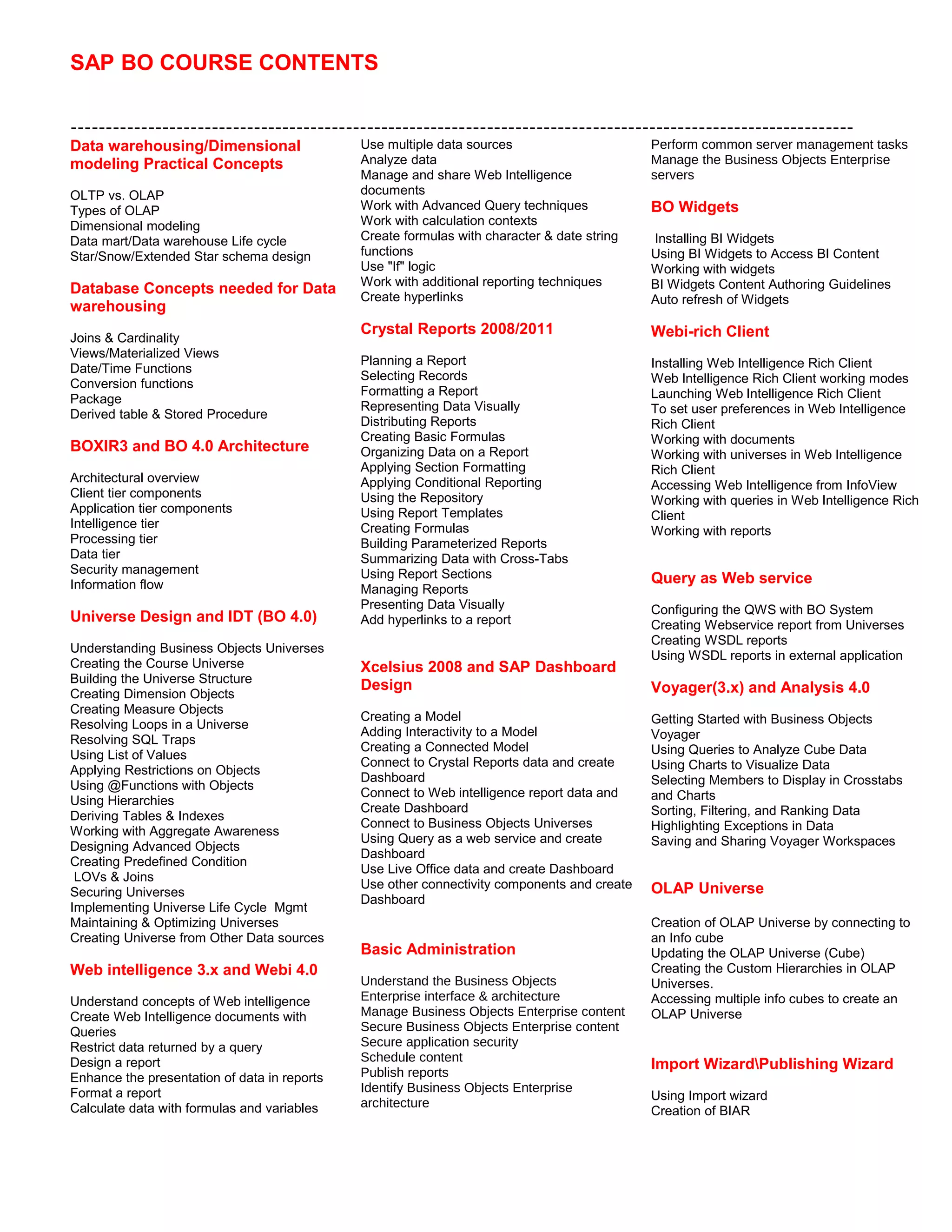 This document outlines the course contents for an SAP BO training which includes topics like dimensional modeling, universe design, Web Intelligence, Crystal Reports, Dashboards, administration, integration with SAP, and performance tuning. The course covers concepts, architectures, and hands-on experience with BO tools for data analysis, reporting, and visualization.