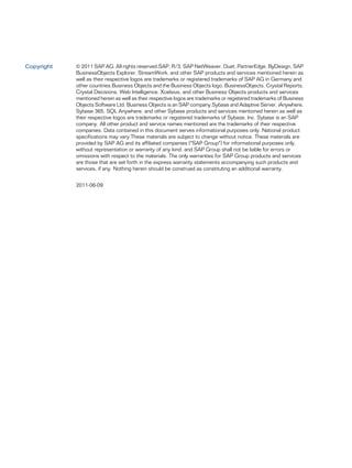 This document provides an overview of the SAP BusinessObjects Data Services Designer user interface and how to work with projects, jobs, and objects. It introduces the main Designer windows and menus and describes how to create, edit, and manage reusable objects and projects as well as view object properties and descriptions. The document also covers general Designer options.