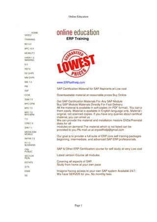 The document outlines the availability of SAP certification materials and training resources for various ERP modules at low costs, emphasizing downloadable and printable original content. It highlights the self-paced online education options and the support for installation and restoration of software materials. The services cater to different levels of SAP professionals with a promise of comprehensive training packages.