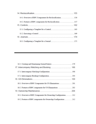 This document provides an overview of key concepts and processes covered in an SAP BPC 10.1 book, including overviews of the BPC components used for planning and consolidation, available dimensions and their properties, currency translation process flows, examples of IC matching and booking, US eliminations, and eliminations and adjustments process flows, illustrated through various images and diagrams.