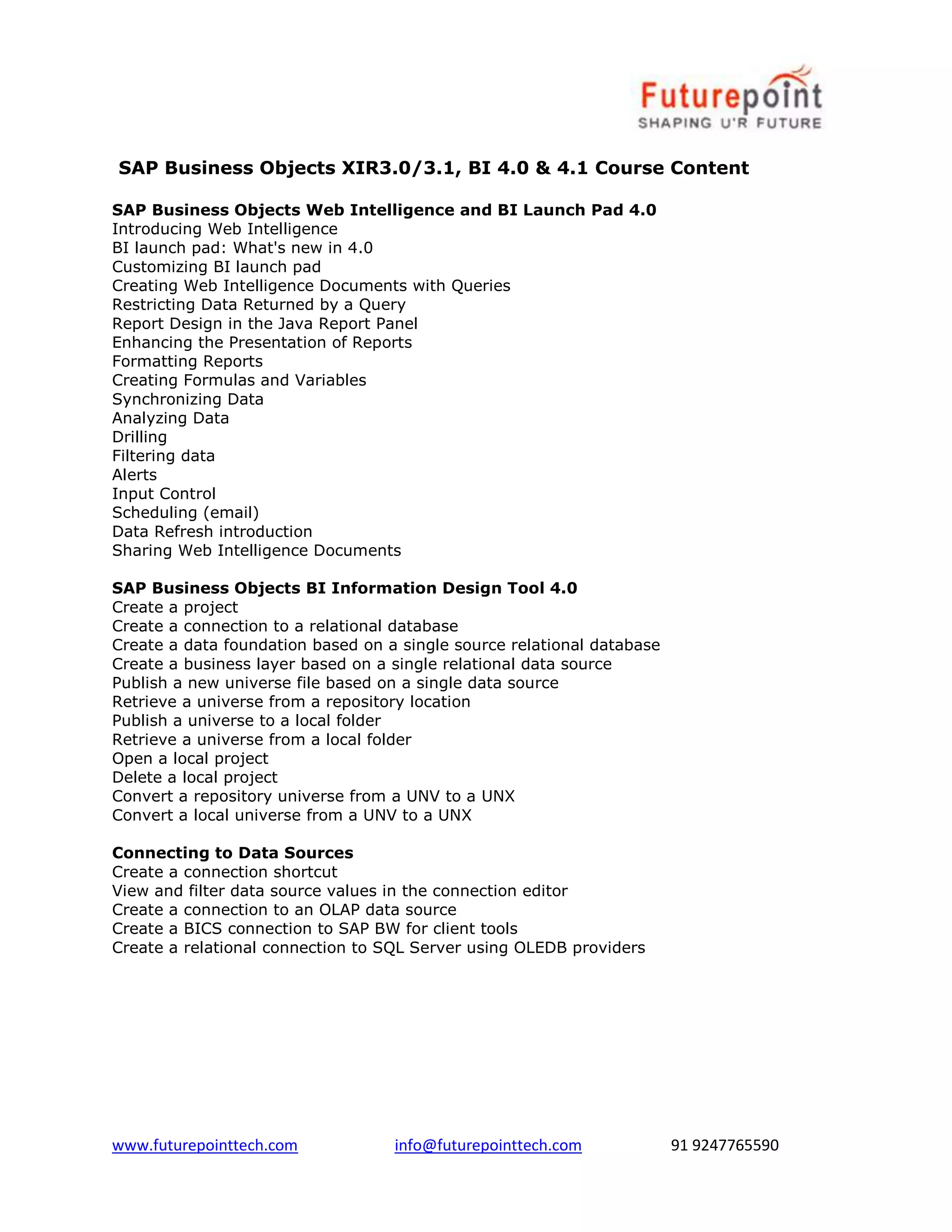 The document outlines a comprehensive training course on SAP Business Objects and related tools, including Web Intelligence, Crystal Reports, and Dashboards. It details course content, techniques for data visualization, report creation, management, and security, along with various SAP-related technologies and frameworks. Additionally, it provides contact information for Future Point Technologies, offering a wide range of IT training courses.