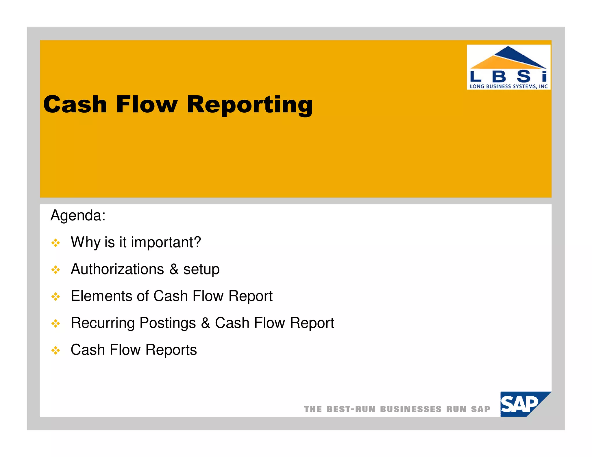 This document provides an overview of cash flow reporting in SAP Business One. It discusses why cash flow planning is important, key liquidity ratios to monitor, how to set up cash flow line items and assign them to transactions, and how to generate and analyze cash flow reports. The presentation was given by Long Business Systems, Inc. to provide guidance on using SAP Business One's cash flow reporting tools to better manage cash flow and ensure obligations can always be met.