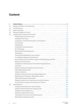 The document discusses SAP's Central Finance solution, which allows companies to establish a centralized SAP S/4HANA system for financial reporting and processing without disruption to existing system landscapes. Key capabilities include replicating financial and management accounting postings from source systems to a central system for common reporting, mapping different accounting entities across systems to a single structure, and executing select financial processes centrally. The document provides information on configuration, data mapping, tax reporting, payment processing and other components of Central Finance implementations.