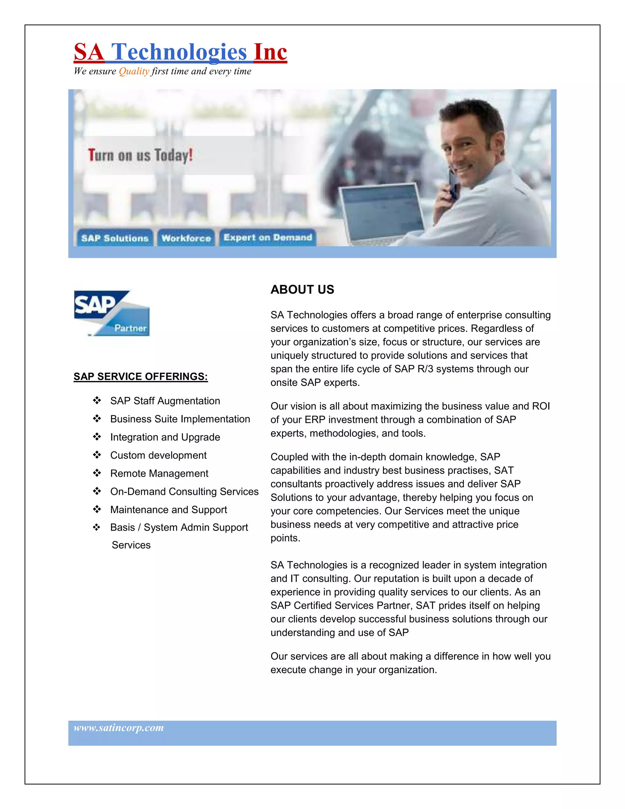 SA Technologies is an SAP consulting firm that offers a range of SAP-related services including implementation, custom development, support and staff augmentation. They aim to maximize their clients' ROI from SAP investments through their experts and methodologies. They provide qualified SAP consultants through their workforce and offer an "Expert on Demand" program for quick resolution of issues without long-term hiring.