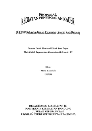 Dokumen ini adalah proposal kegiatan penyegaran kader di RW 07 Kelurahan Garuda, Kecamatan Ciroyom, Kota Bandung, yang disusun oleh Marni Banowati untuk pelatihan kader dalam meningkatkan pengetahuan dan keterampilan mereka dalam pelayanan kesehatan masyarakat. Pelatihan ini mencakup berbagai modul terkait kesehatan, seperti imunisasi, gizi, dan penyakit diare, dengan tujuan agar kader mampu menjadi fasilitator dan motivator bagi masyarakat. Kegiatan ini bertujuan untuk meningkatkan kesadaran kader mengenai masalah kesehatan yang ada di lingkungan mereka.