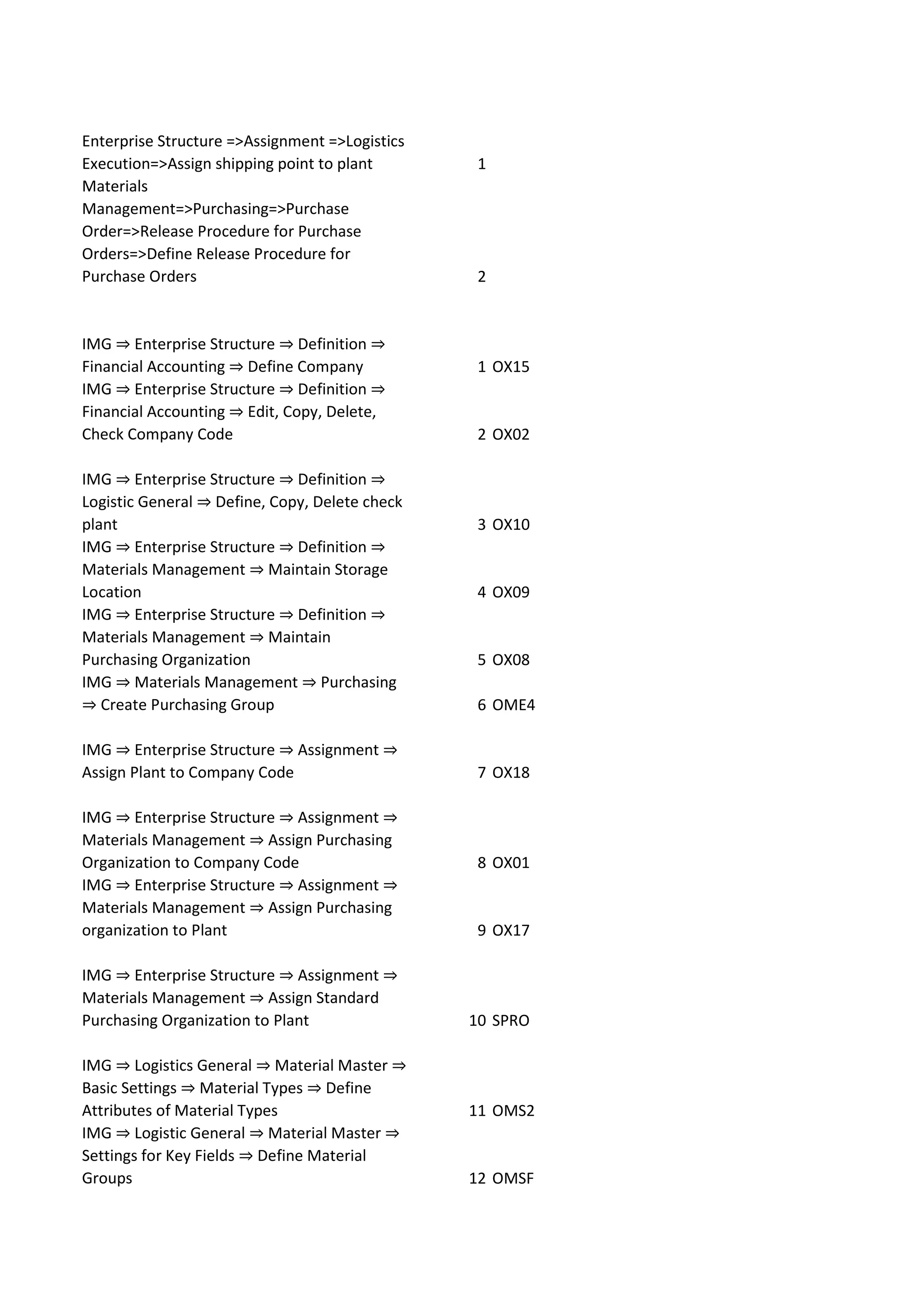 The document lists various configuration steps for setting up different areas in an SAP system, including: defining company codes and plants; maintaining material, storage location and purchasing organization master data; configuring purchase orders, purchase requisitions and requests for quotation; and setting up valuation and account determination.