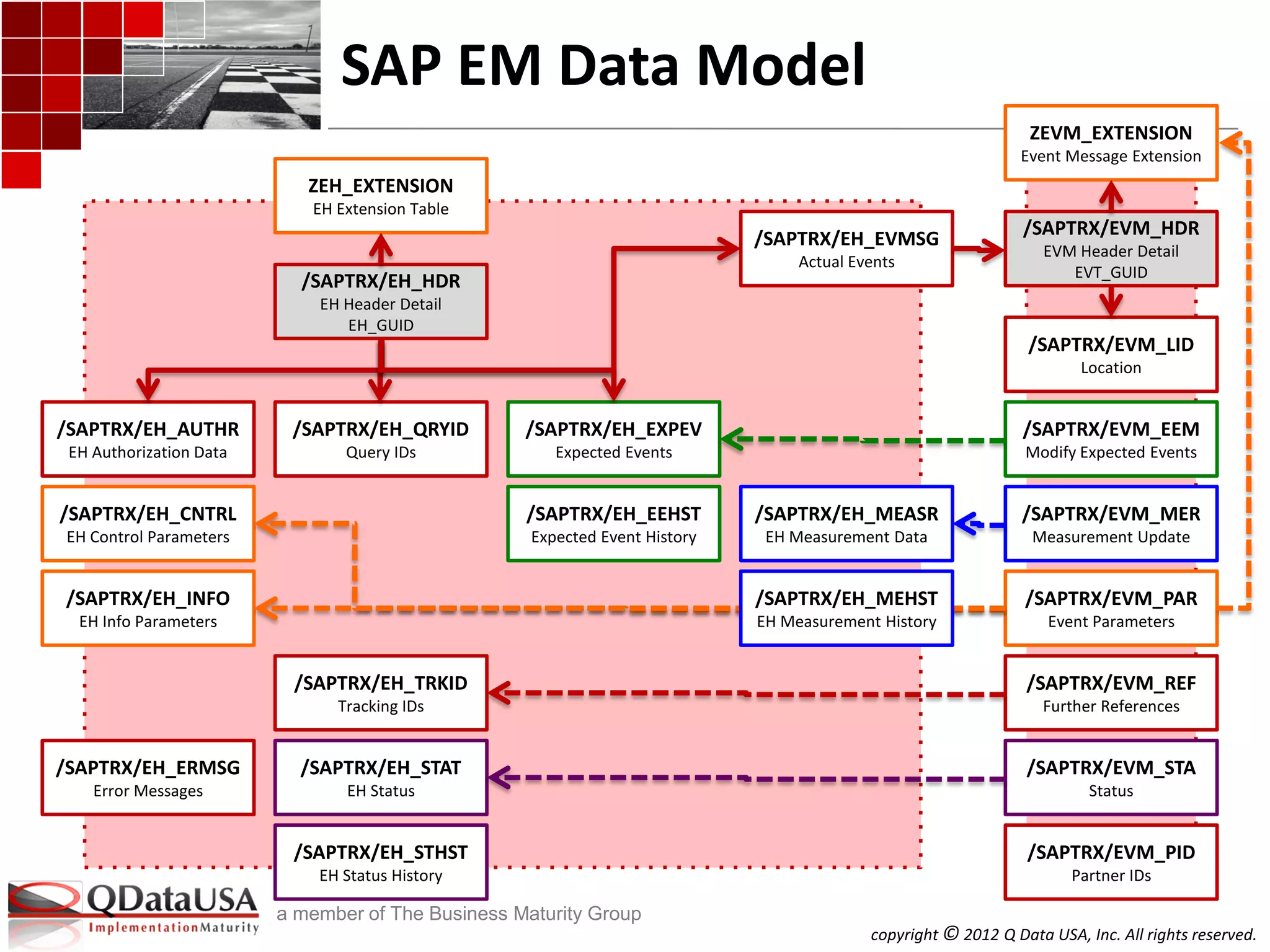 copyright © 2012Q Data USA, Inc. All rights reserved. a member of The Business Maturity Group SAP EM Data Model /SAPTRX/EH_HDR EH Header Detail EH_GUID /SAPTRX/EVM_HDR EVM Header Detail EVT_GUID ZEH_EXTENSION EH Extension Table /SAPTRX/EH_AUTHR EH Authorization Data /SAPTRX/EH_CNTRL EH Control Parameters /SAPTRX/EH_INFO EH Info Parameters /SAPTRX/EH_EEHST Expected Event History /SAPTRX/EH_EXPEV Expected Events /SAPTRX/EH_EVMSG Actual Events /SAPTRX/EH_MEASR EH Measurement Data /SAPTRX/EH_QRYID Query IDs /SAPTRX/EH_STAT EH Status /SAPTRX/EH_STHST EH Status History /SAPTRX/EH_TRKID Tracking IDs /SAPTRX/EH_ERMSG Error Messages /SAPTRX/EVM_EEM Modify Expected Events /SAPTRX/EVM_MER Measurement Update /SAPTRX/EVM_LID Location /SAPTRX/EVM_PAR Event Parameters /SAPTRX/EVM_PID Partner IDs /SAPTRX/EVM_REF Further References /SAPTRX/EVM_STA Status ZEVM_EXTENSION Event Message Extension /SAPTRX/EH_MEHST EH Measurement History