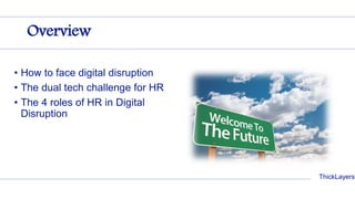 This document discusses the roles of human resources (HR) in addressing digital disruption. It identifies four key roles: the Rainmaker, who governs digital transformation initiatives; the Breeder, who ensures the organization has the necessary competencies; the Layer, who creates a new digital HR platform; and the Mutant, who digitally empowers HR. It then provides more details on each role, including how the Rainmaker can take different approaches to managing digital initiatives, how the Breeder must transform work in response to changing human needs and the future of work, how the Mutant must develop new digital skills, and how the Layer can position HR as a platform within the organization.