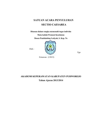 Dokumen ini merupakan laporan penyuluhan tentang perawatan ibu setelah menjalani bedah caesar yang dilaksanakan oleh akademi keperawatan pada 6 November 2014. Tujuan penyuluhan adalah untuk memberikan pemahaman mengenai indikasi, faktor predisposisi, dan penatalaksanaan pasca operasi sectio caesarea. Metode penyuluhan meliputi ceramah, tanya jawab, dan diskusi, dan diharapkan peserta dapat menyimpulkan materi dengan baik.
