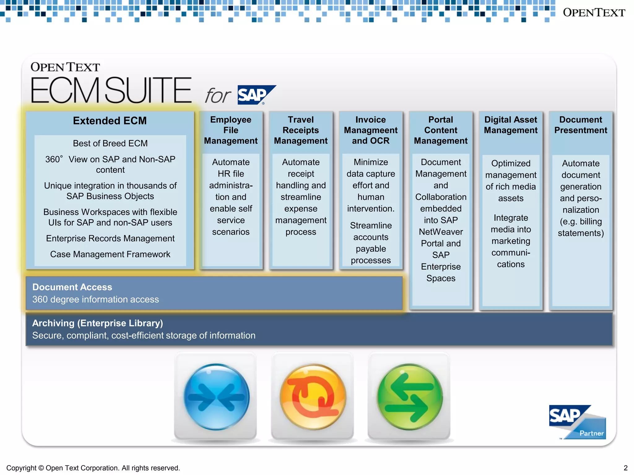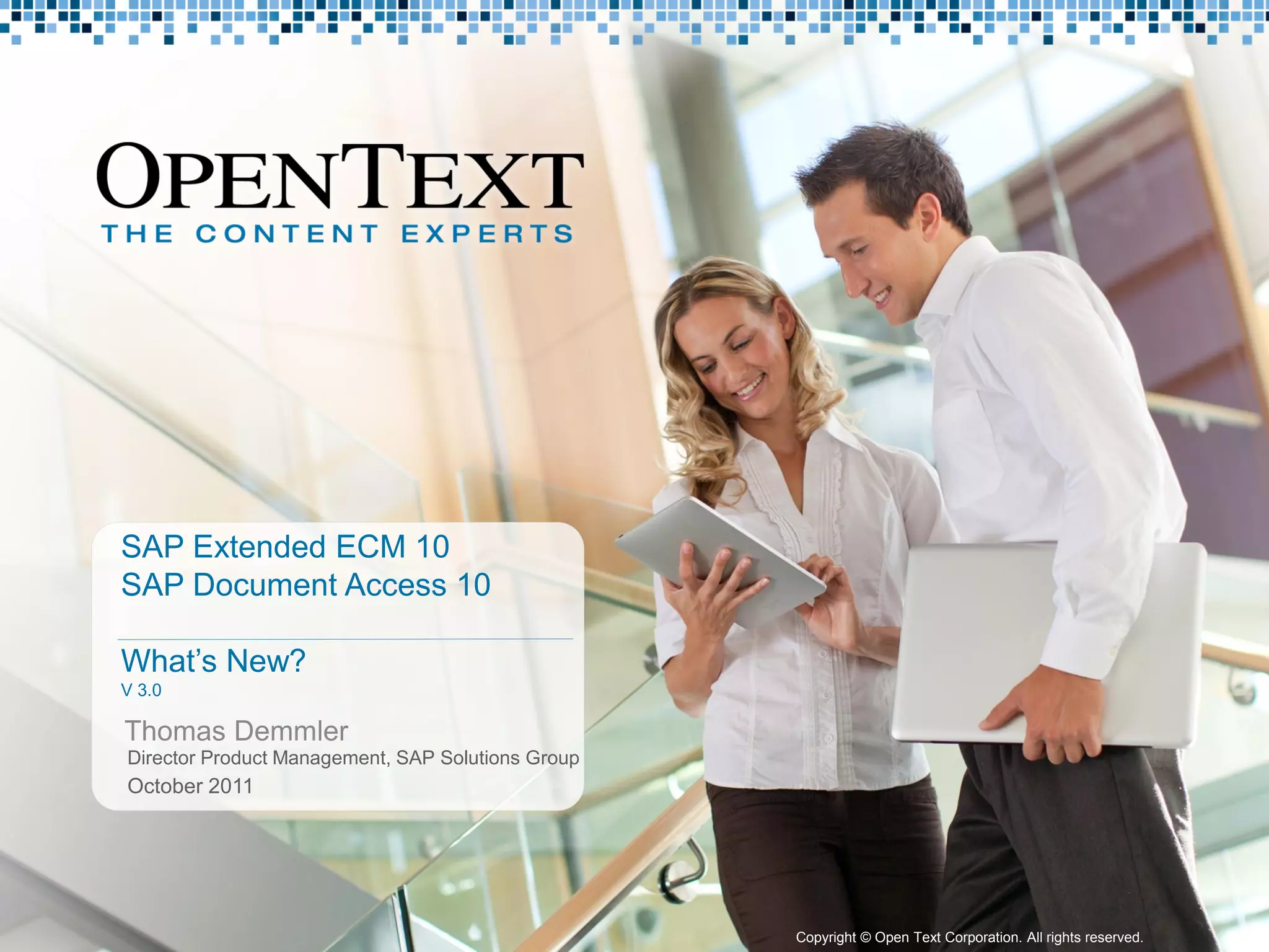 The document outlines the enhancements in SAP Extended ECM 10, emphasizing its integration capabilities with SAP business processes and content management. Key benefits include improved business process efficiency, regulatory compliance, and enhanced customer interaction through various scenarios like customer service, sales, and human resources. The version also introduces features like Archivelink Plus and comprehensive portal integration, enabling more effective document management and user engagement.