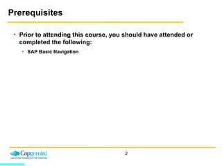 The document outlines the prerequisites and agenda for a General Ledger Accounting SAP end-user training course, highlighting foundational knowledge required and the course objectives such as understanding journal entries, profit centers, and reporting. It details the organizational structure of financial accounting within SAP, including master data management, general ledger functionalities, and the significance of profit and cost centers. The training emphasizes the importance of compliance, data quality, and team engagement during the course sessions.