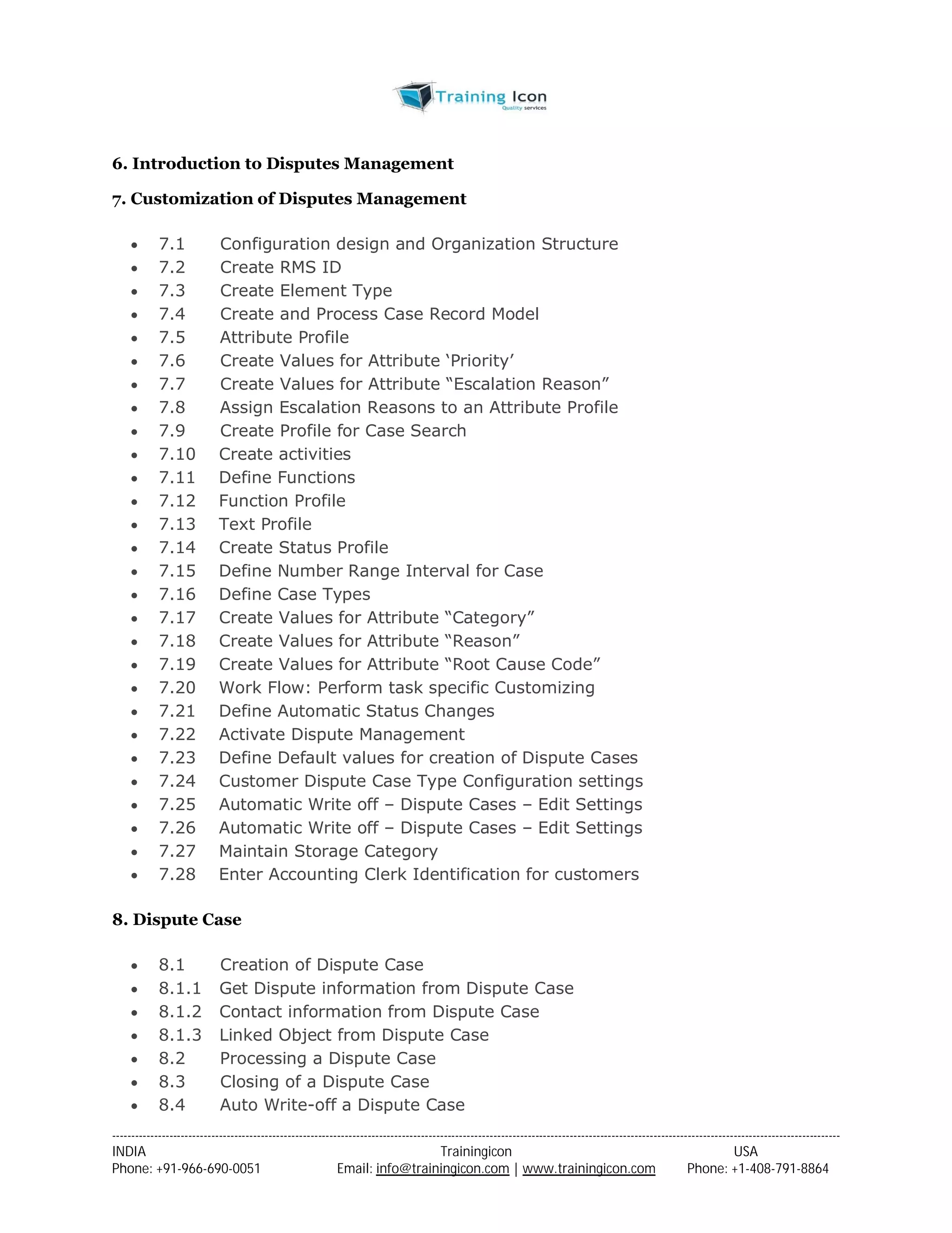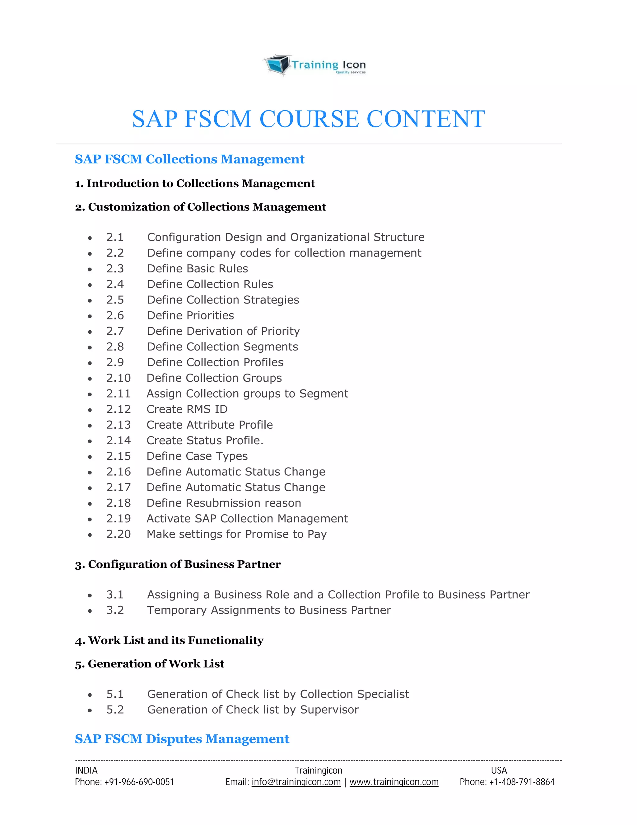 The document outlines the course content for SAP FSCM, focusing on Collections Management, Disputes Management, Credit Management, and Treasury and Risk Management. It includes detailed steps for customization, configuration, and functionality for each area, such as creating profiles, managing cases, and handling various financial instruments. Additionally, it covers cash management processes and external payment routing.