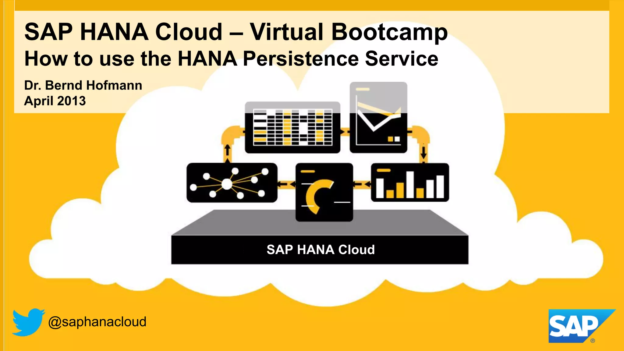 This document provides an overview and introduction to using the SAP HANA Cloud Persistence Service. It discusses how applications can access SAP HANA databases in the cloud using JDBC or JPA, and focuses on JPA as the preferred method. It demonstrates how to add persistence to applications using EclipseLink as the JPA implementation and includes steps for configuring applications to work with SAP HANA Cloud. The presentation concludes with reminders of related resources and a question/answer discussion section.