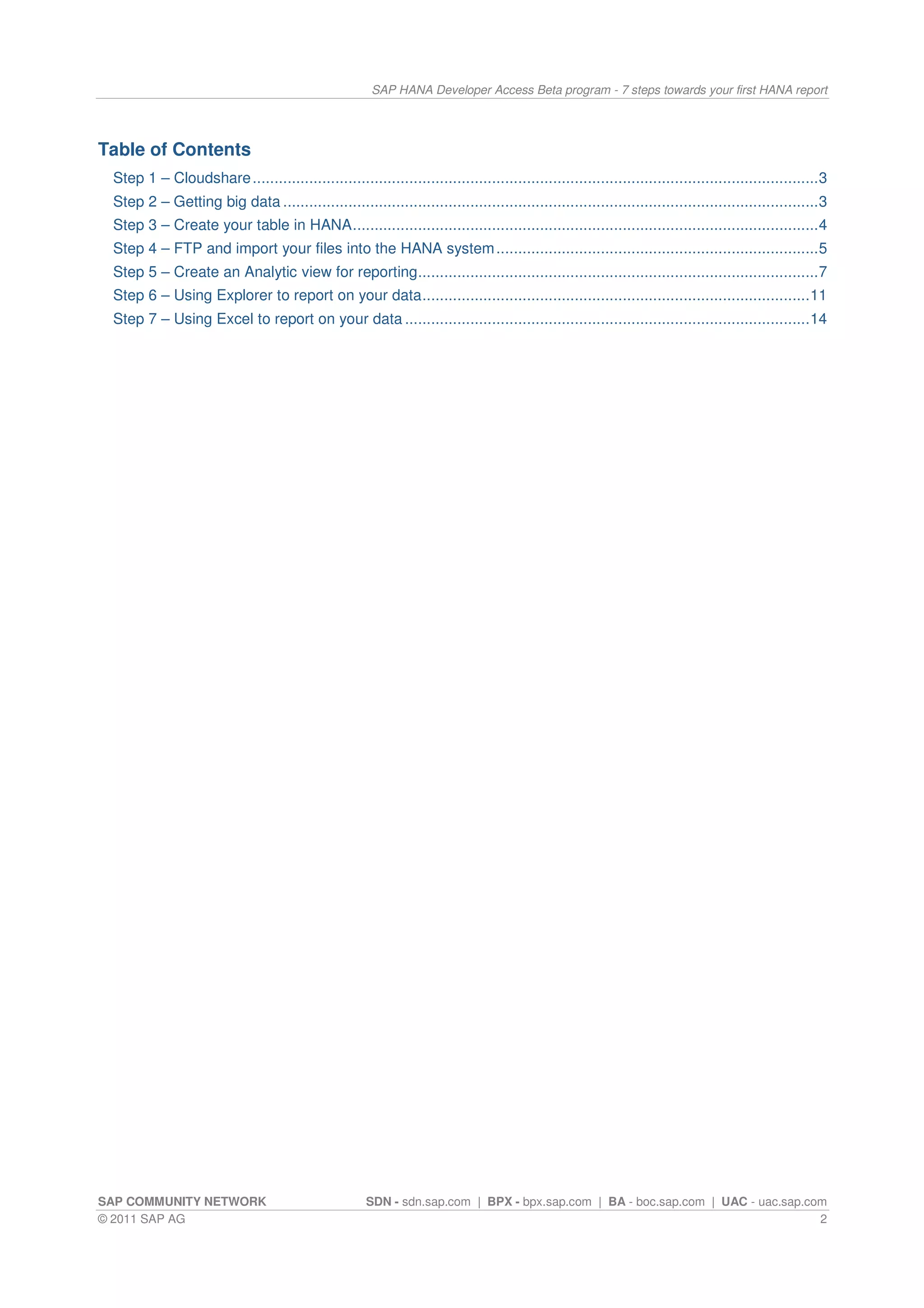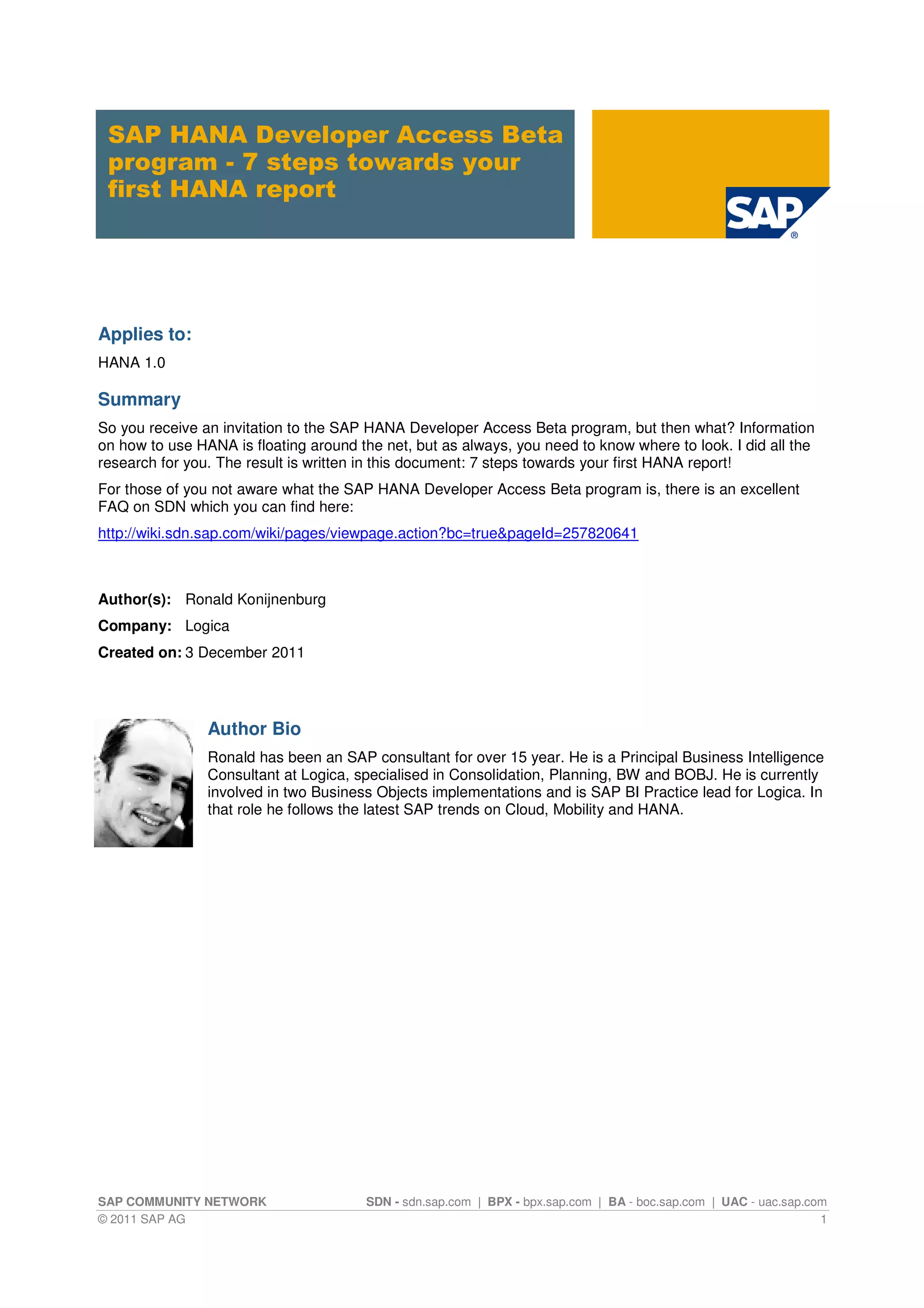 The document outlines a step-by-step guide for participants in the SAP HANA Developer Access Beta Program to create their first HANA report. It includes instructions on setting up a HANA system, importing data, creating tables and analytic views, and using reporting tools like Explorer and Excel. The author, Ronald Konijnenburg, is an experienced SAP consultant who provides practical tips and resources throughout the guide.