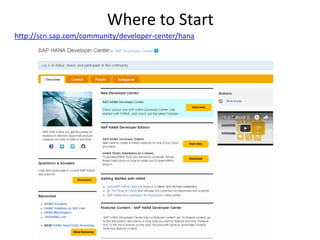 SAP HANA is an in-memory database platform that stores transactional data in memory for real-time analytics by eliminating disk input/output lag; it uses columnar storage with efficient compression and built-in indexing for each column to enable fast queries and joins; SAP HANA features include predictive analytics, multitenant containers, high availability, and tools for data modeling, administration, and development.