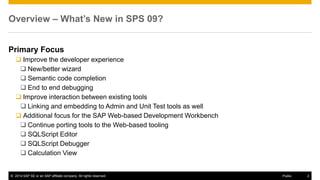 The document summarizes the new features and enhancements in SAP HANA SPS 09 related to development tools. Key updates include improvements to the developer experience with the SAP HANA Web-based Development Workbench, including new editors for objects like SQLScript, XSODATA, roles, and more. The SAP HANA Studio was also enhanced with features like one-click debugging between XSJS and SQLScript, direct editing from the repository browser, and semantic code completion.