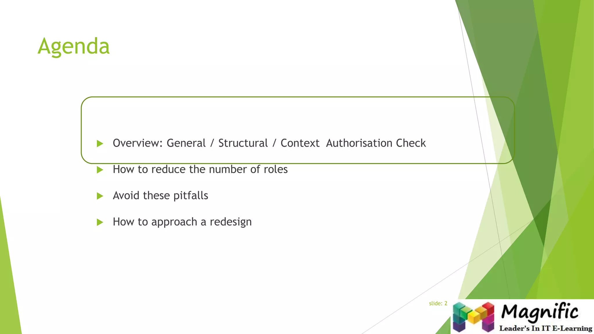 This document discusses SAP HCM online and remote training provided by Magnific Training. It focuses on reducing the number of roles in SAP HCM through techniques like dynamic start objects, using custom objects and BAdIs, and implementing reference roles. The document provides examples and tips on how to design dynamic profiles based on organizational units and create context-dependent authorizations. It also discusses how to leverage functions like RH_GET_ORG_ASSIGNMENT and coding in P_NNNNN to dynamically determine access based on attributes like cost center.